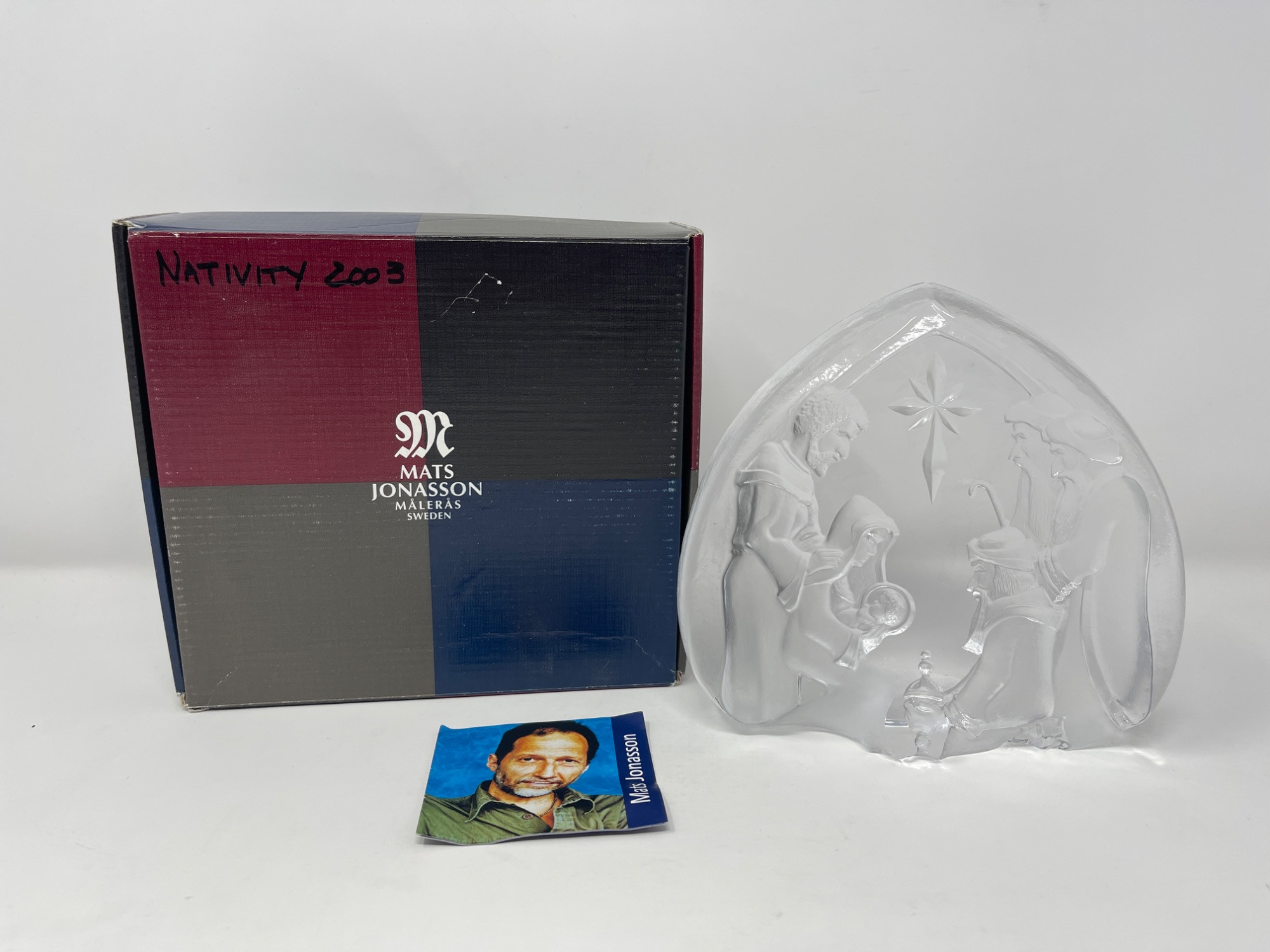 Etched crystal nativity sculpture by Swedish artist Mats Jonasson, featuring a detailed depiction of the Three Wise Men presenting gifts to the child of Christ. Made in Sweden and signed, this 2003 piece comes w/ original presentation box and brochure.