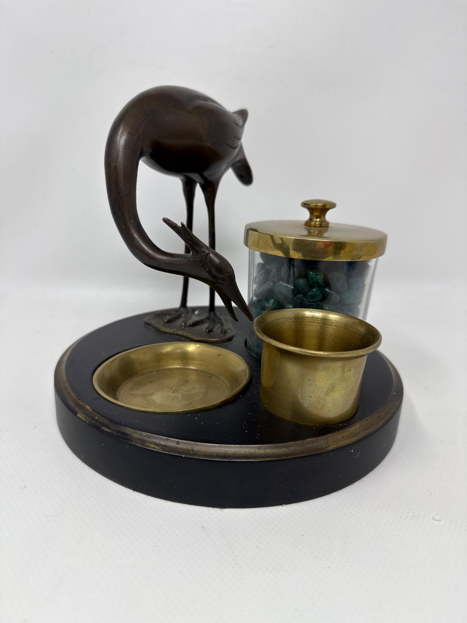 Art Deco Bronze Crane Desk Organizer w/ Brass Dishes & Decorative Stones