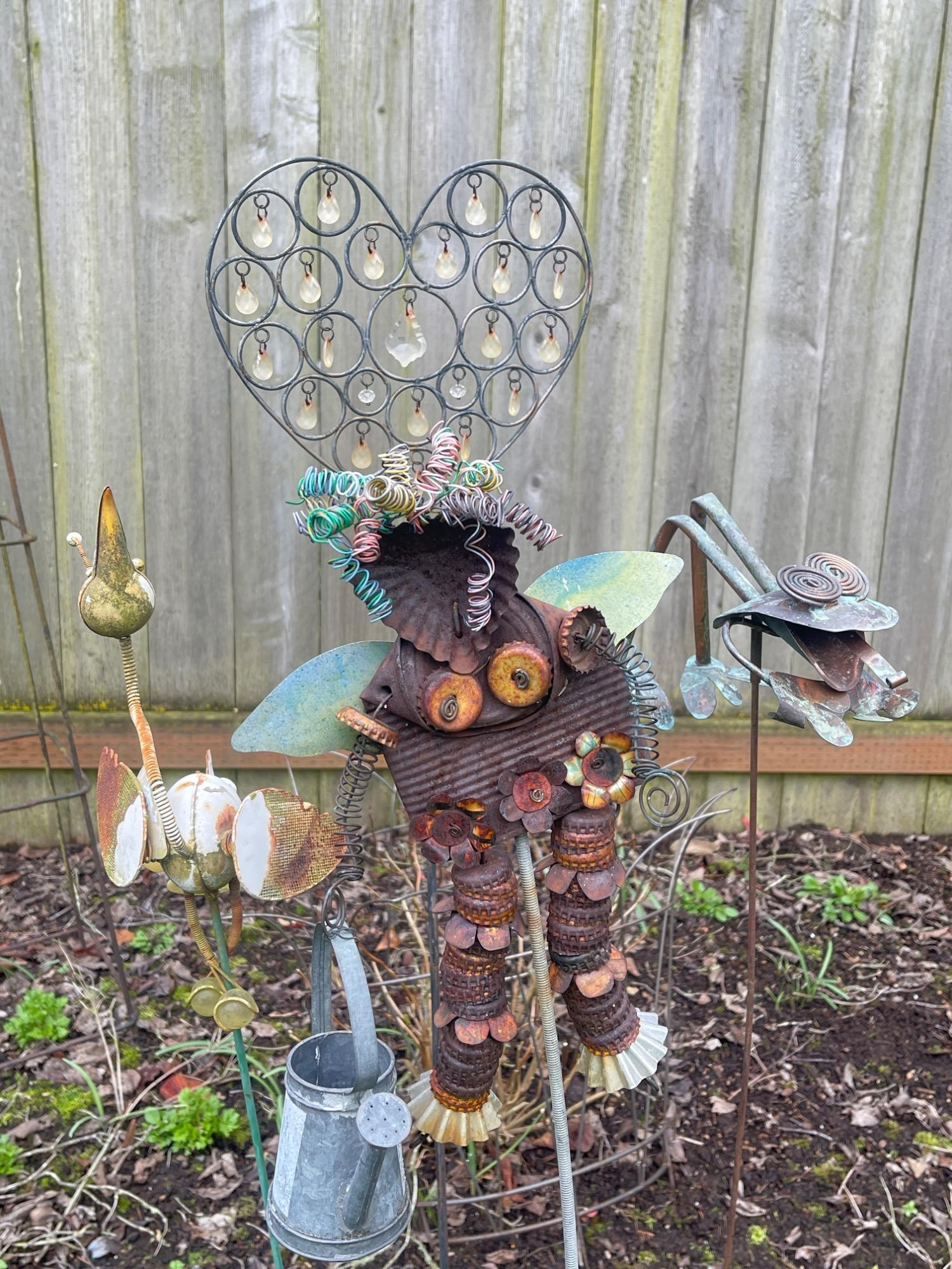 Stick Garden Art Assortment Whimsical garden art assortment featuring colorful and rustic stick-mounted figures crafted from a variety of reclaimed and repurposed materials. Includes sculptural forms with heart, flower, and insect motifs, as well as metal accents like watering cans and springs. Ideal for adding charm and personality to garden beds, planters, or pathways.