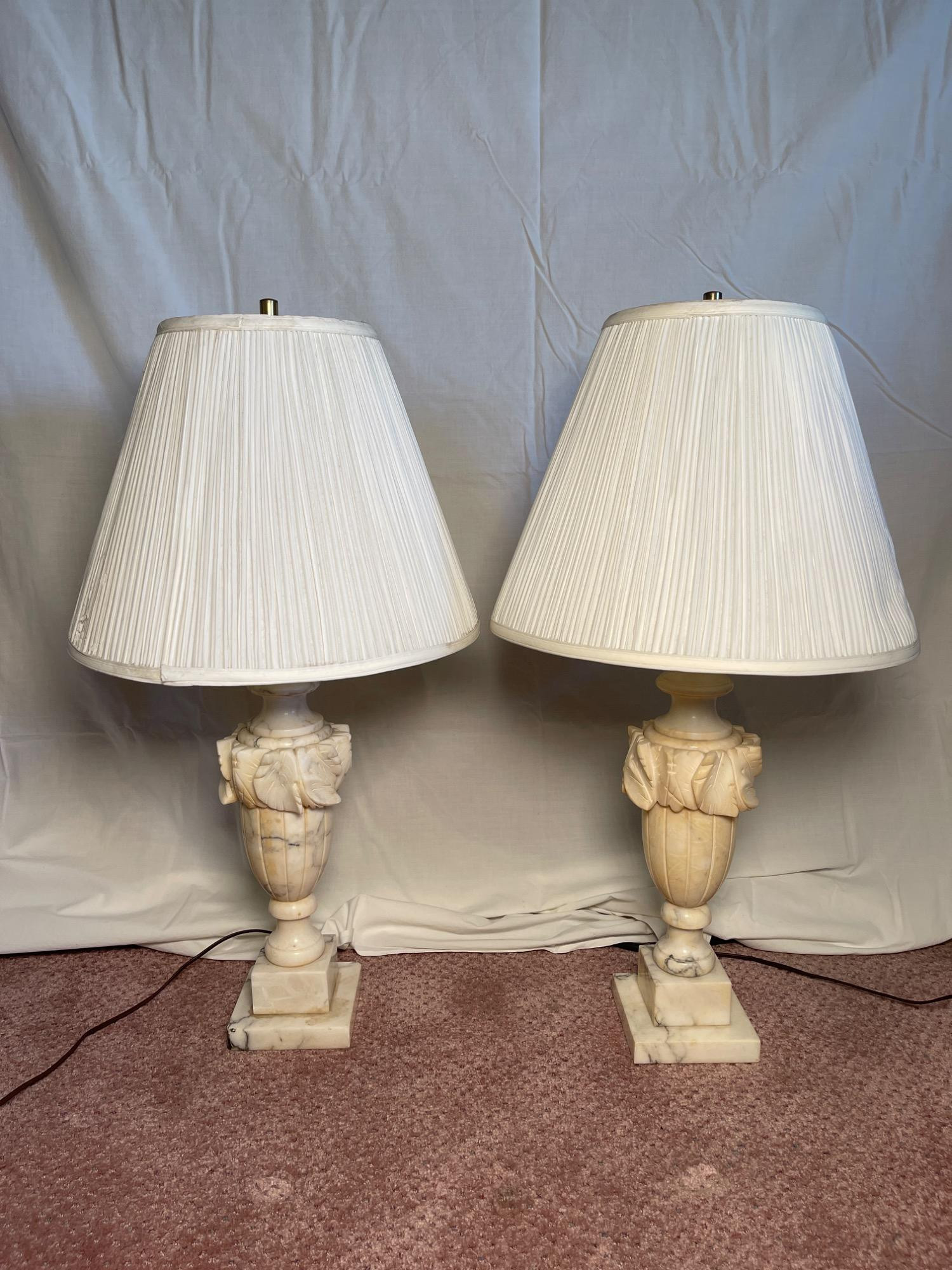 Pair of Carved Alabaster Table Lamps with Shades Elegant pair of carved alabaster table lamps with pleated white fabric shades. Each lamp features an urn-shaped base adorned with leaf and scroll details and is mounted on a square pedestal. Tested and in working condition, these substantial lamps offer timeless style and warm ambient light. Condition: Visible staining and small corner chips on both bases.