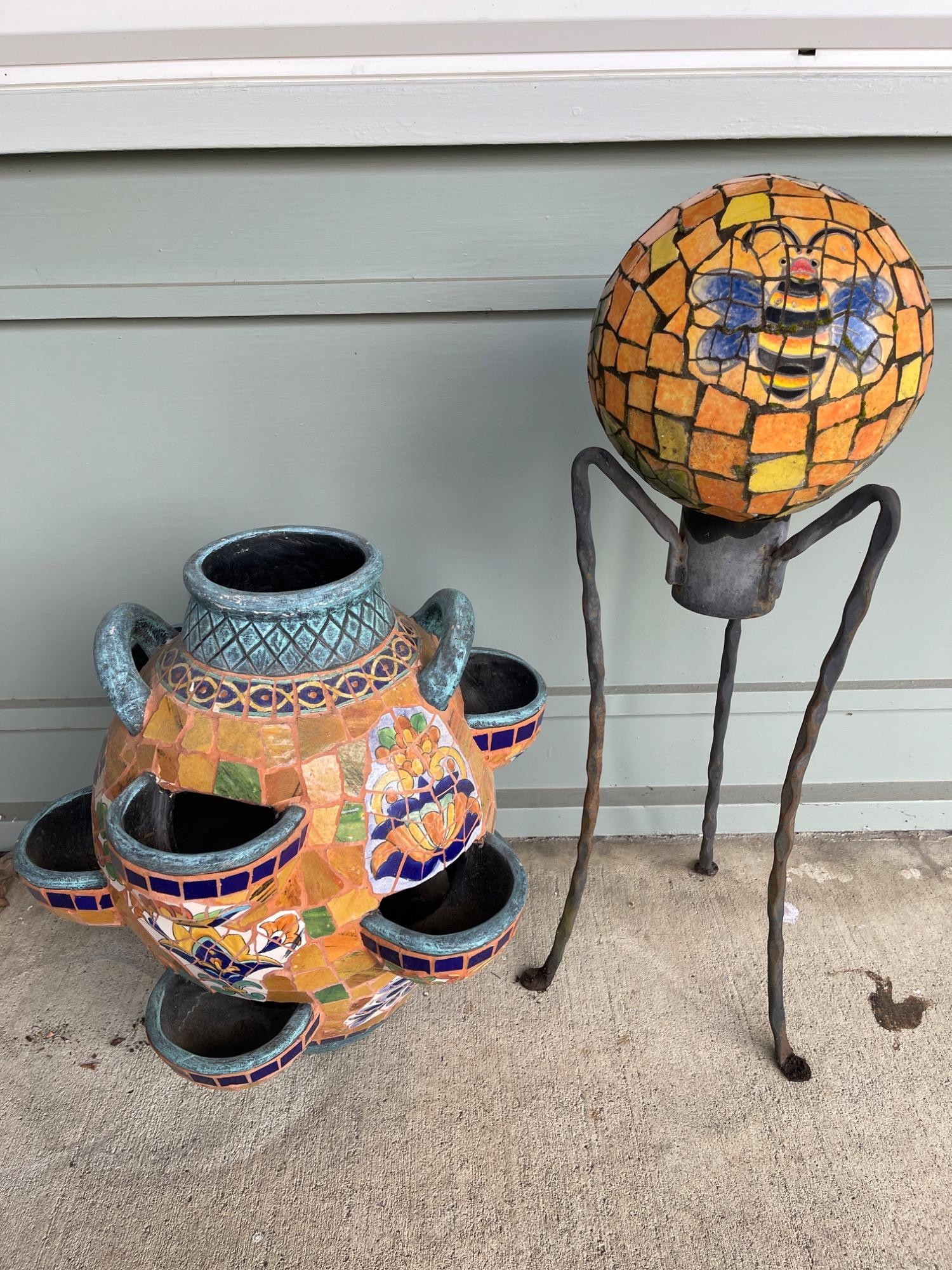 Cheerful folk art garden decor including a large hand-painted terra cotta strawberry pot and a colorful mosaic garden globe with bee motif. The strawberry pot is handmade and kiln-fired, with multiple pockets for planting. Accompanied by a mosaic-tile globe on a three-legged metal stand.