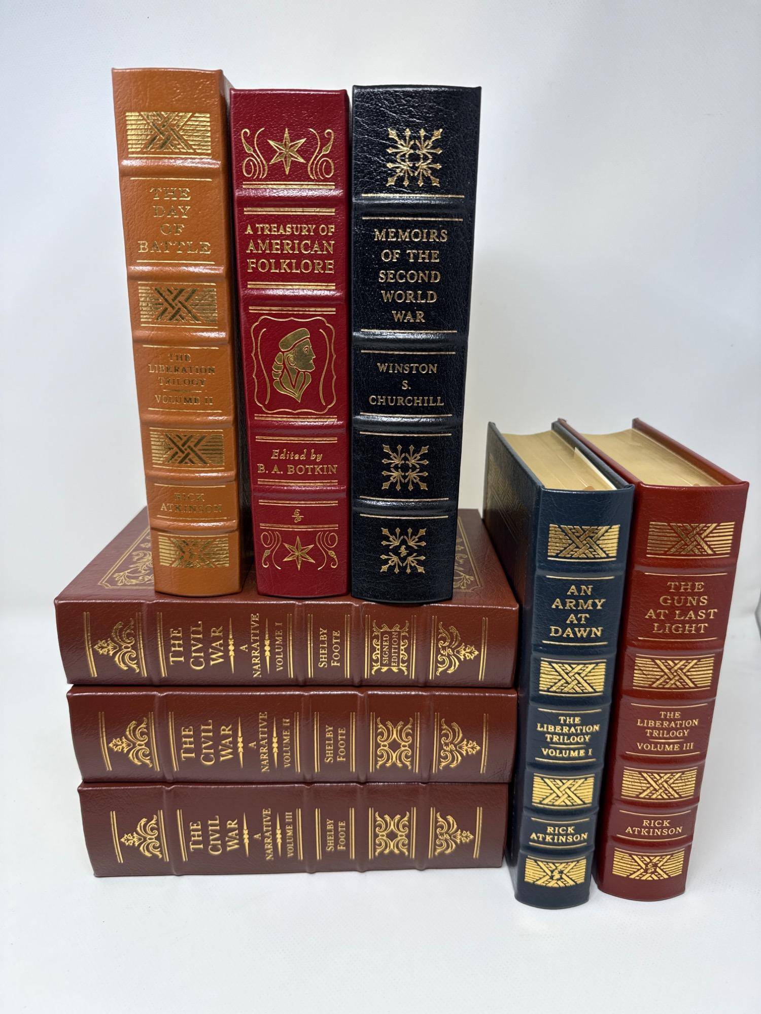WWII, Civil War & Folklore Leatherbound Book Assortment – 8 Volumes Collection of Easton Press and Franklin Library hardcover editions featuring richly embossed leather covers, gilt-edged pages, and sewn bindings. Includes The Day of Battle, Memoirs of the Second World War, An Army at Dawn, The Guns at Last Light, A Treasury of American Folklore, and Shelby Foote’s The Civil War: A Narrative (Volumes I–III). Condition: Minor shelf wear