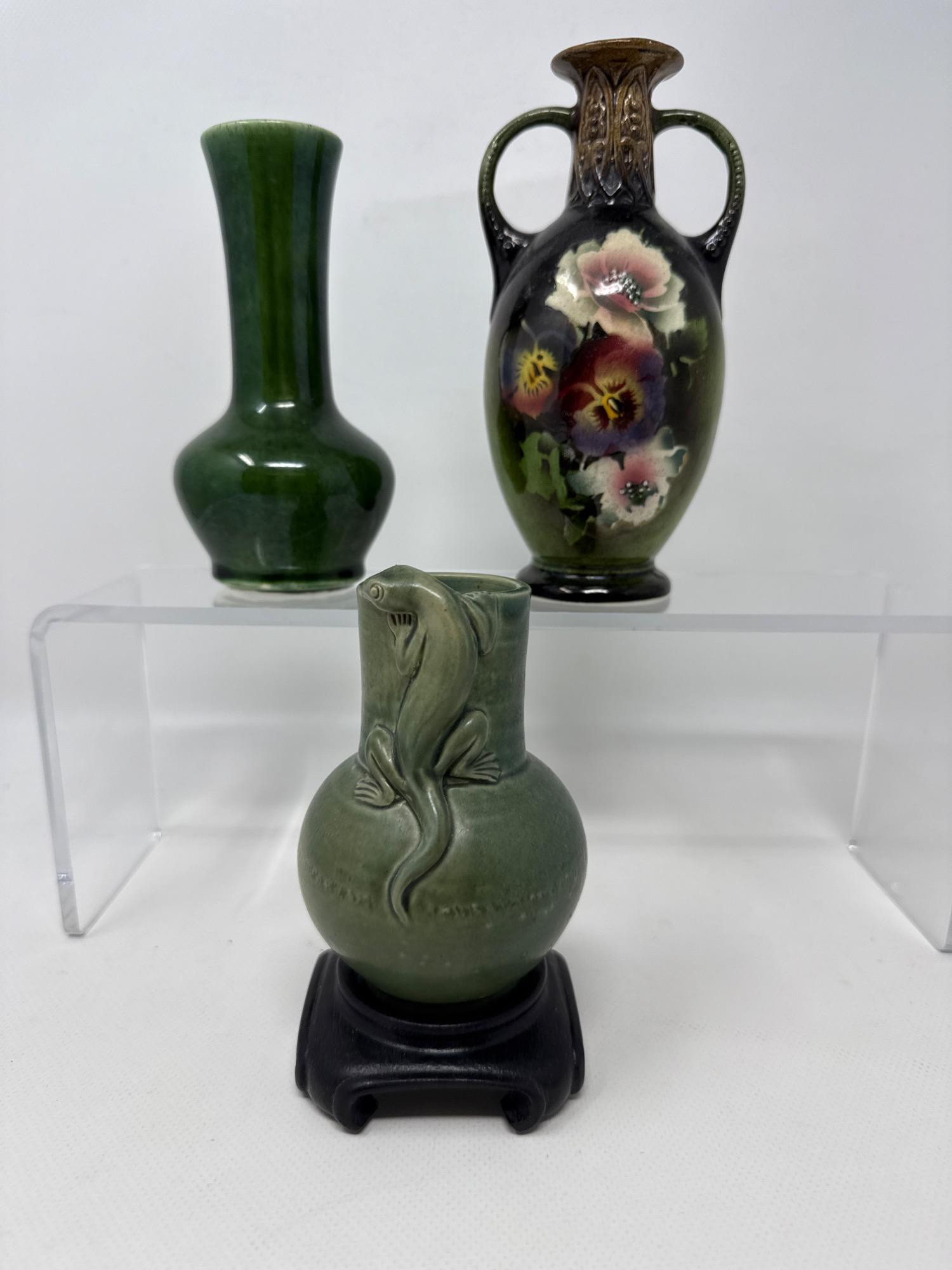 Set of three small green ceramic vases: a classic McCoy USA vase with rich glaze, a hand-painted Czechoslovakian vase with dual handles and pansy motif, and a unique matte-finish vase with sculpted lizard detail, marked “8” on base and presented on a wooden stand.