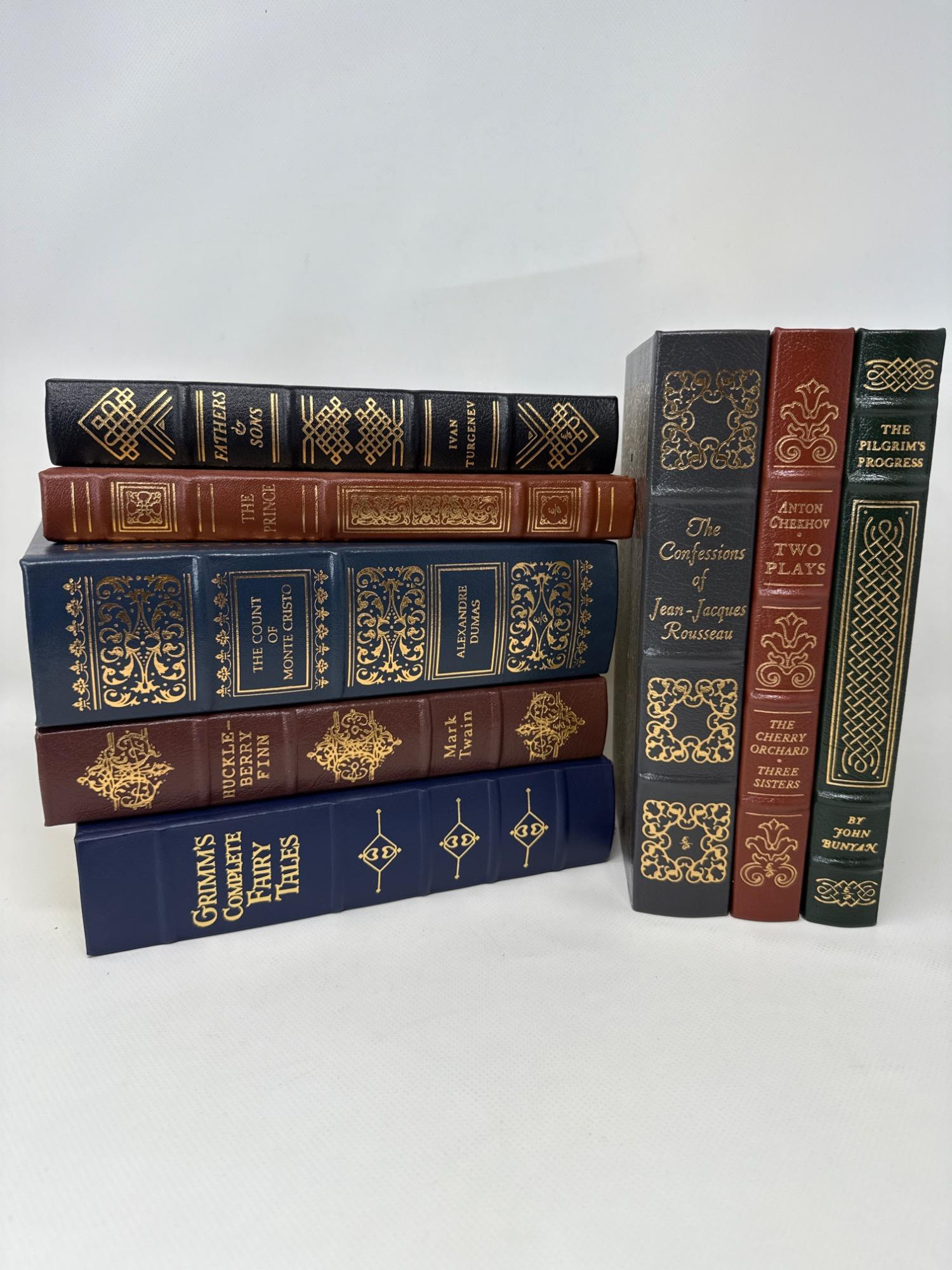 Collection of 9 Easton Press and Franklin Library classics featuring gilt-edged pages, silk ribbon bookmarks, and highly embellished leather covers. Titles include The Confessions of Jean-Jacques Rousseau, Grimm’s Complete Fairy Tales, The Prince, Fathers and Sons, The Count of Monte Cristo, The Adventures of Huckleberry Finn, Two Plays by Anton Chekhov (The Cherry Orchard and Three Sisters), and The Pilgrim’s Progress.
