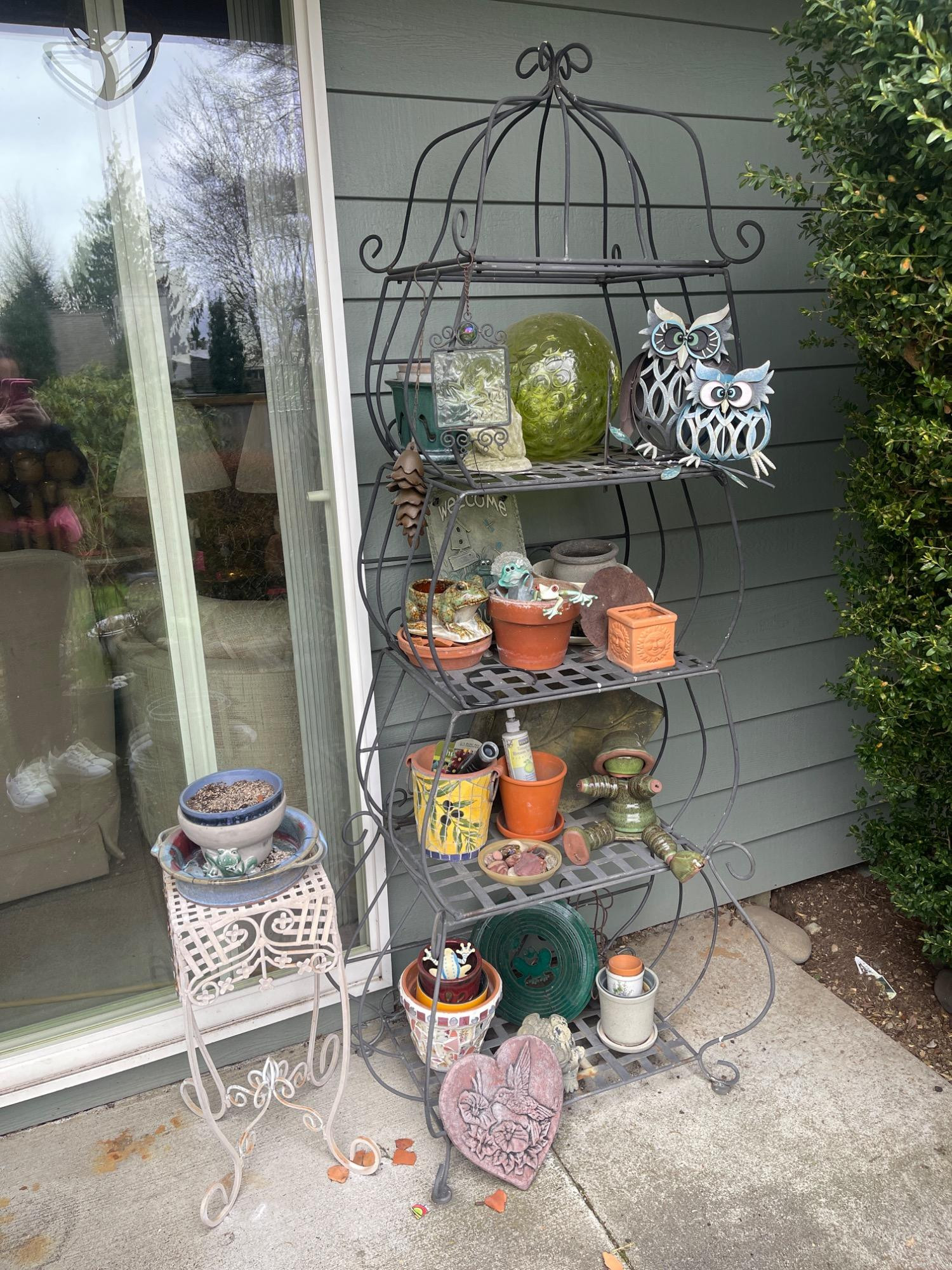 Outdoor Decor Assortment – Wrought Iron Shelf, Planters & Accents