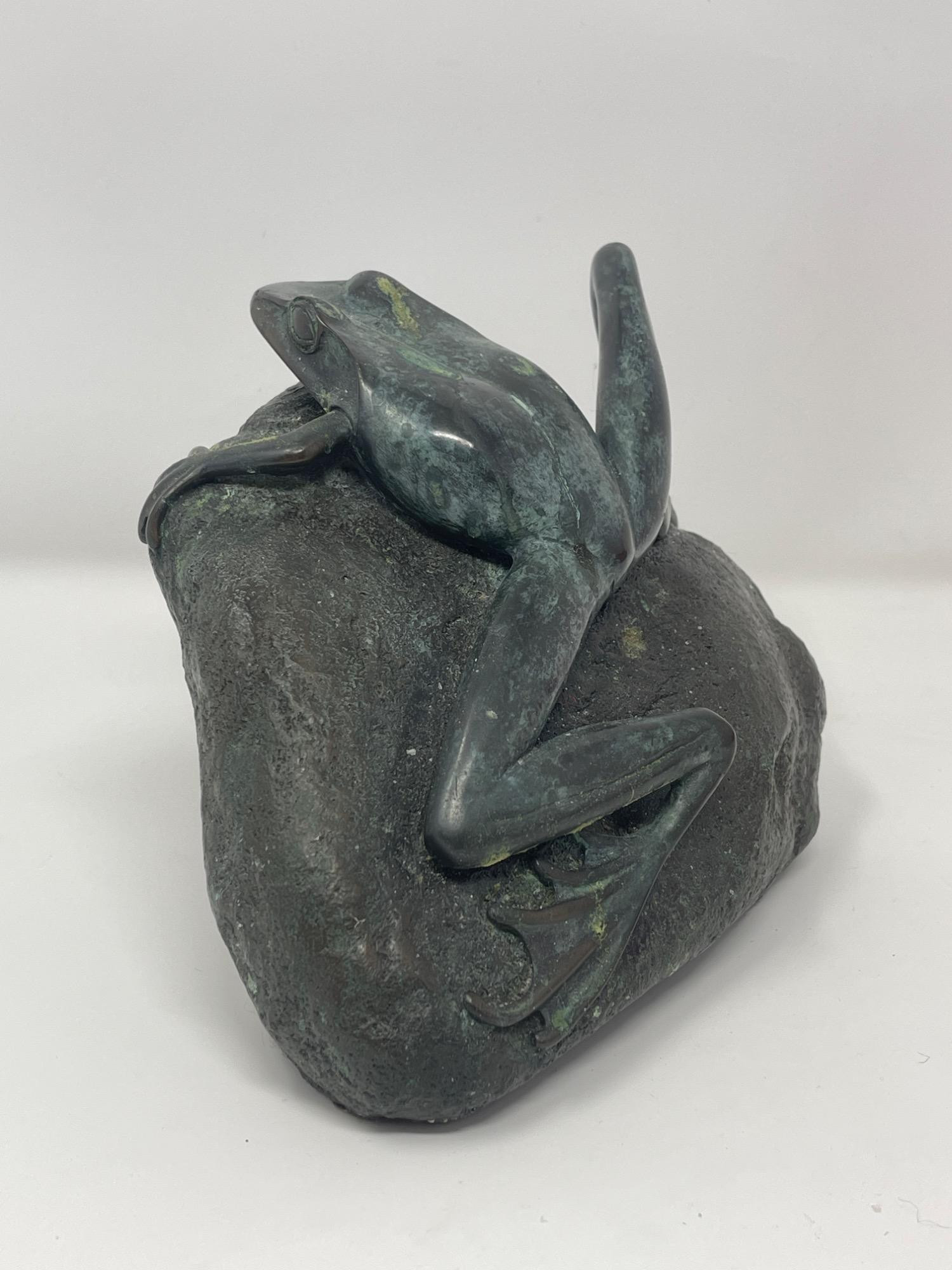 Cast bronze sculpture by Phil Vanderlei featuring a realistically modeled frog lounging atop a textured rock. Created as a special limited edition for The Nature Company, with artist inscription and patinated finish highlighting sculptural detail. Condition: Minor surface residue and wear consistent with age