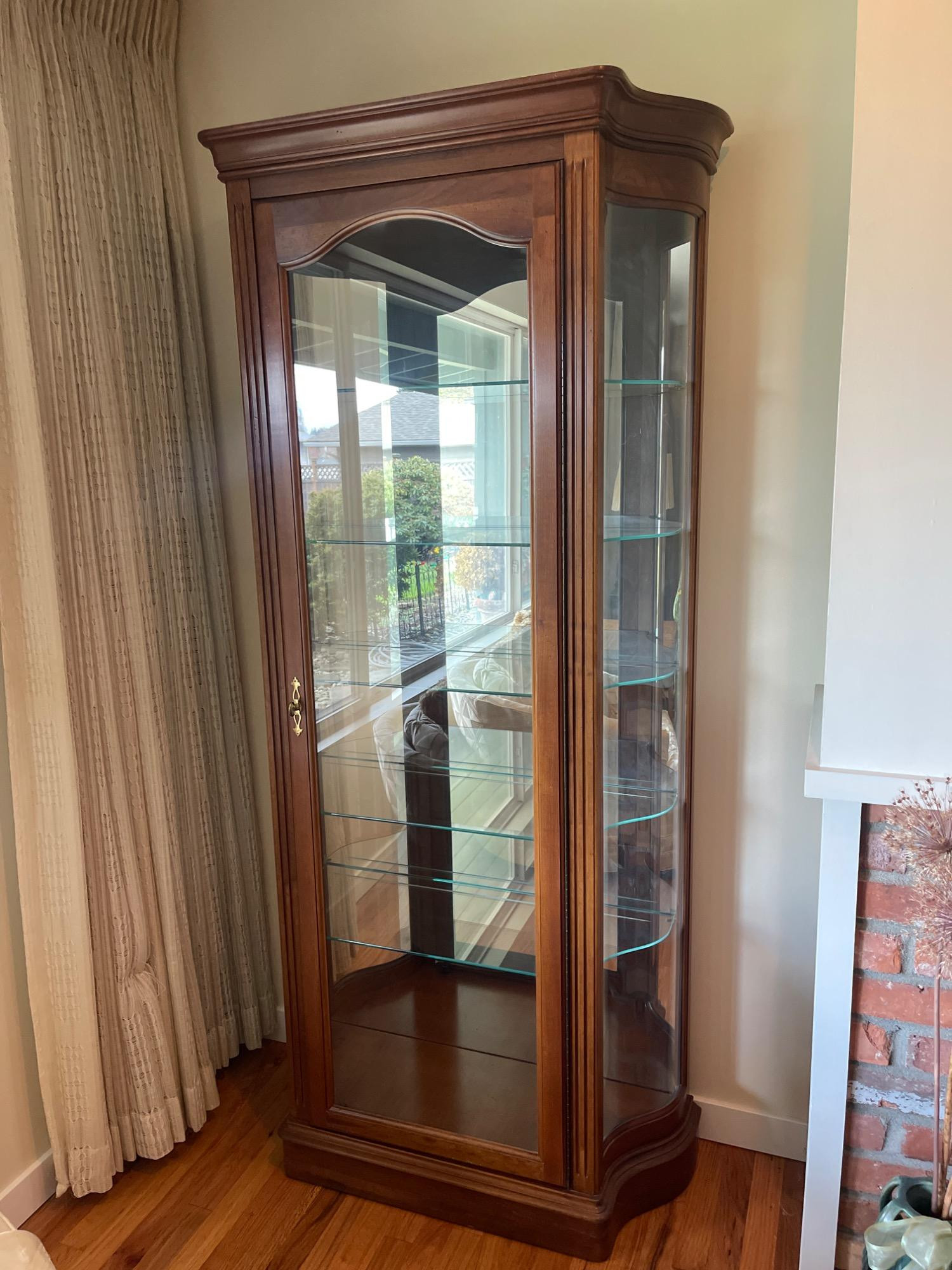 Glass Curio Cabinet #2 with Mirrored Back – Elegant Wood Finish Elegant display curio cabinet featuring a curved glass front, five glass shelves, side glass panels, and a mirrored back. Finished in a warm-toned wood with a molded crown and decorative keyhole hardware. Built-in lighting is present but untested. Purchased for $1,350. Condition: Very good overall; lights untested.