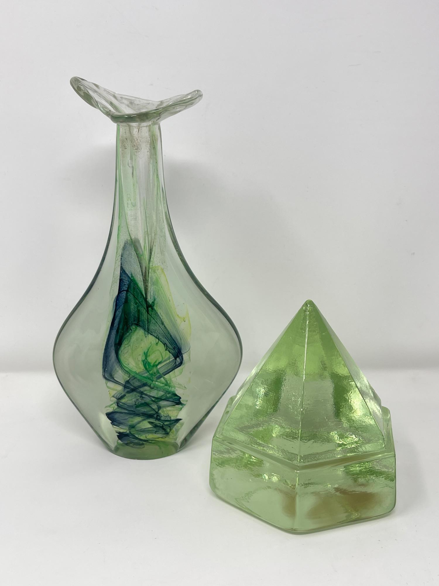 Two-piece collection featuring a handblown art glass vase with flared mouth and swirling green and blue interior ribbons, paired with a green glass nautical deck prism in classic pyramid form. The prism was historically used to refract sunlight into ships’ cargo holds, now often repurposed as decorative or paperweight pieces.