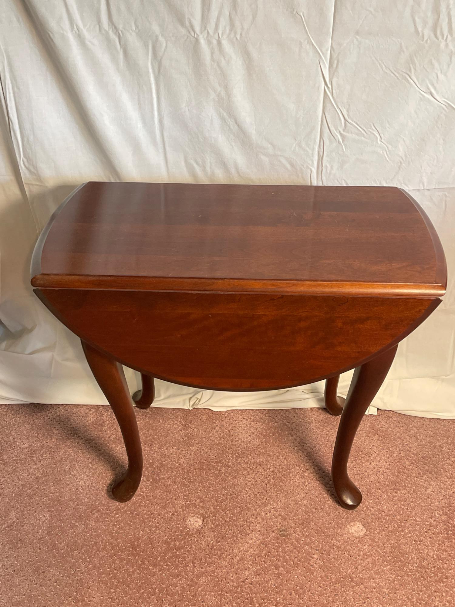 Classic drop-leaf table featuring a rich cherry-toned finish and elegant Queen Anne legs. The tabletop expands into a rounded oval shape when both leaves are raised and folds down compactly for space-saving versatility. Ideal as an entry table, breakfast nook piece, or occasional side table.