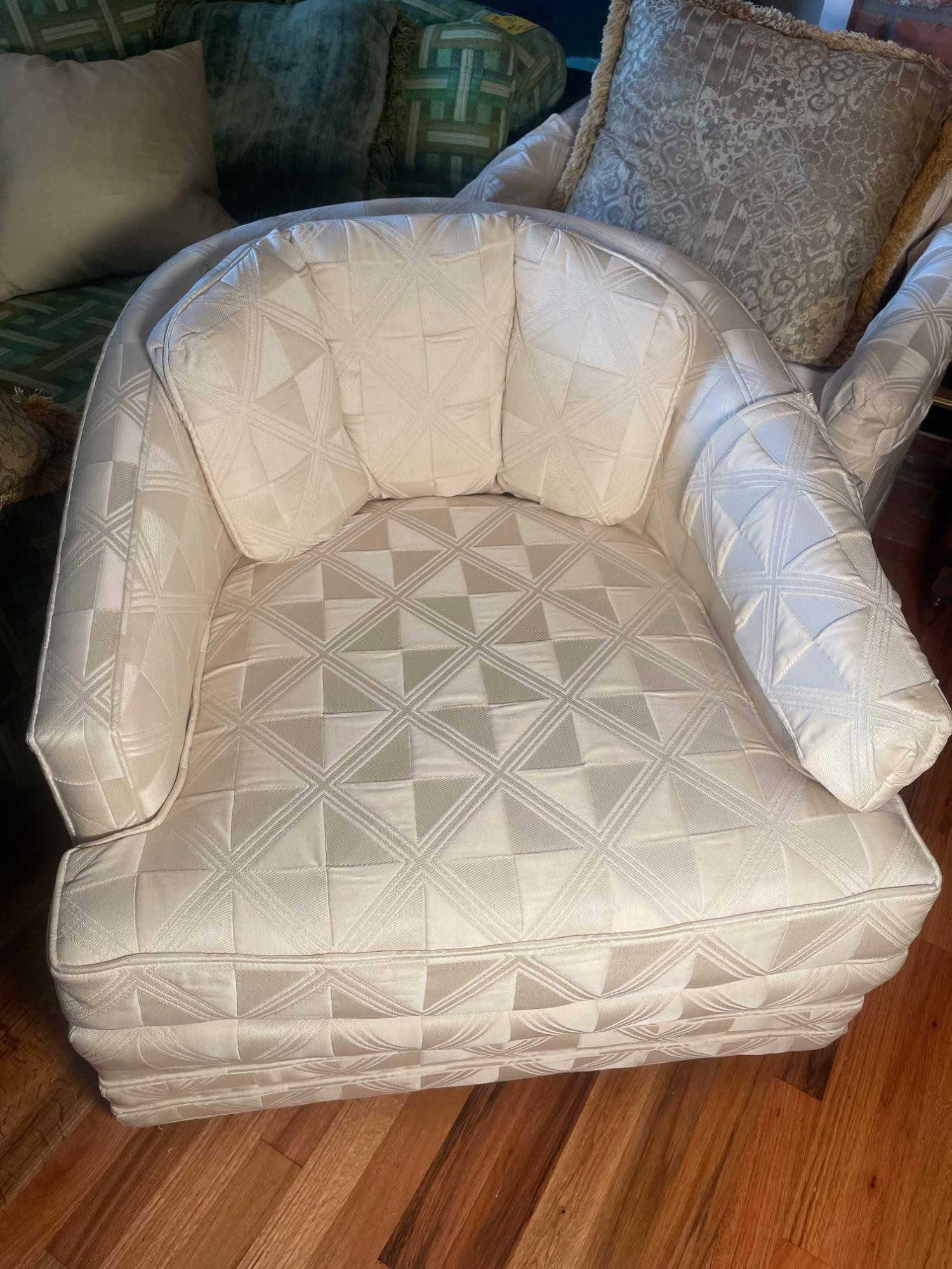 Heritage Distinctive Upholstery Swivel Club Chair #2 Upholstered swivel club chair by Heritage, featuring a soft geometric pattern in cream with generous cushioning and tailored piping. The wide seat and wraparound backrest offer comfort and support in a classic silhouette.