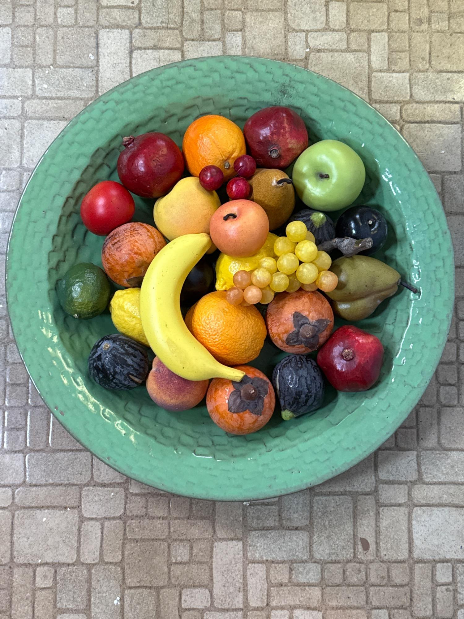 Vibrant collection of realistic hand carved alabaster fruit from Berti Roberto of Italy, arranged in a large textured green stoneware bowl. The set includes a colorful array of fruits such as persimmons, grapes, lemons, bananas, pomegranates, and more, each intricately sculpted with impressive detail and variation in color and texture. Includes original brand card. Condition: Light wear to a few fruit pieces; overall excellent display condition