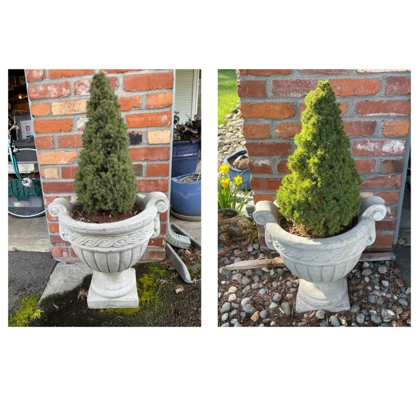 Classic urn-style concrete planters with ornate relief detail and scroll handles, each holding a small conifer shrub. These substantial and elegant planters are perfect for flanking entryways or enhancing garden symmetry. The included evergreens provide a tidy, sculptural look year-round. Condition: Good; light weathering consistent with outdoor use. Unknown health of plants.