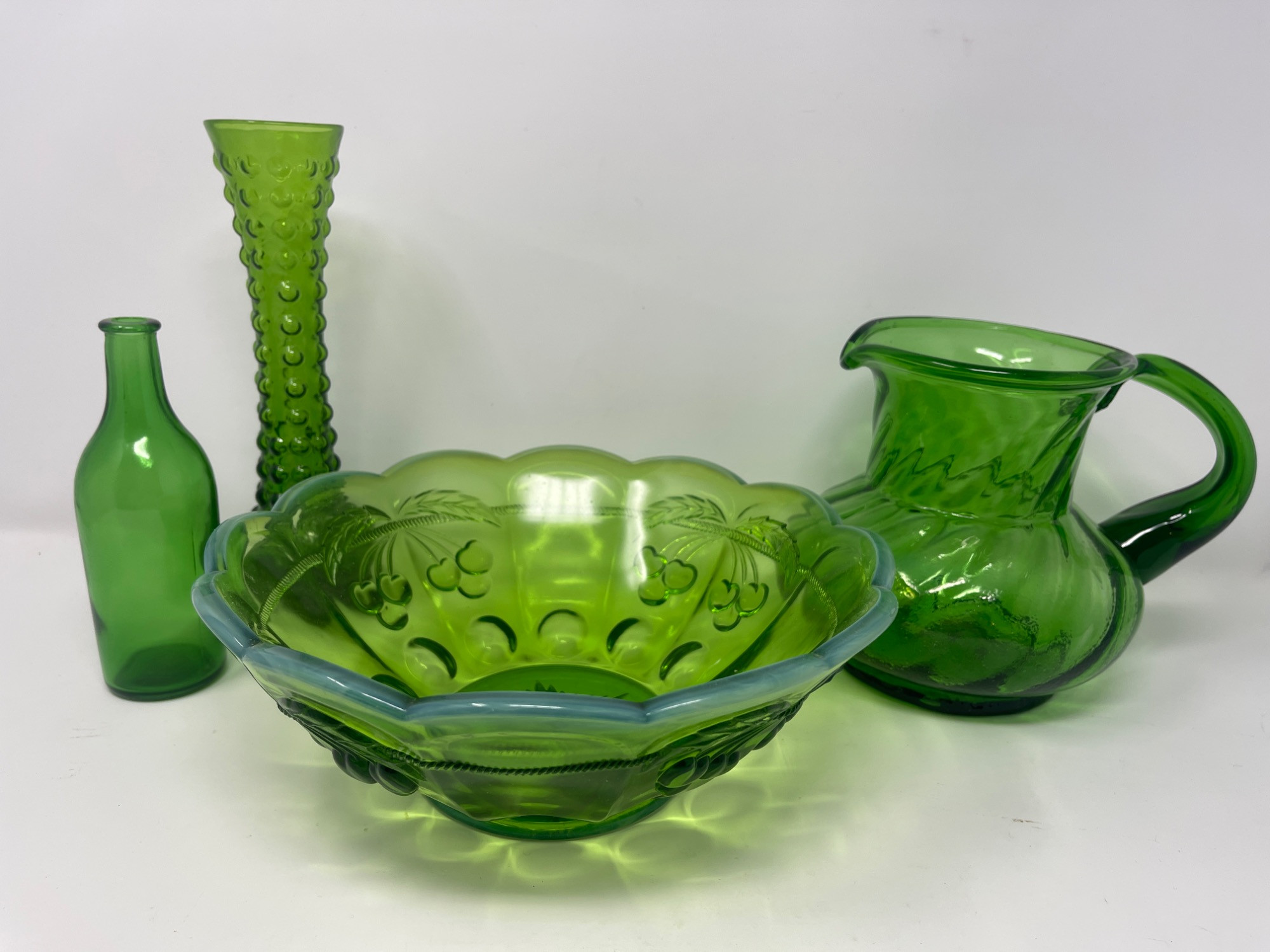 Grouping of four green glass pieces including a cherry-patterned pressed glass bowl, a bulbous pitcher with applied handle, a tall hobnail vase, and a simple bottle. Rich green hues with varied textures make this an eye-catching set for display or everyday use. Condition: No chips or cracks observed Measurements: Bowl: 9.5"W x 3.5"H Pitcher: 7"W x 6"H Vase: 9"H Bottle: 6"H