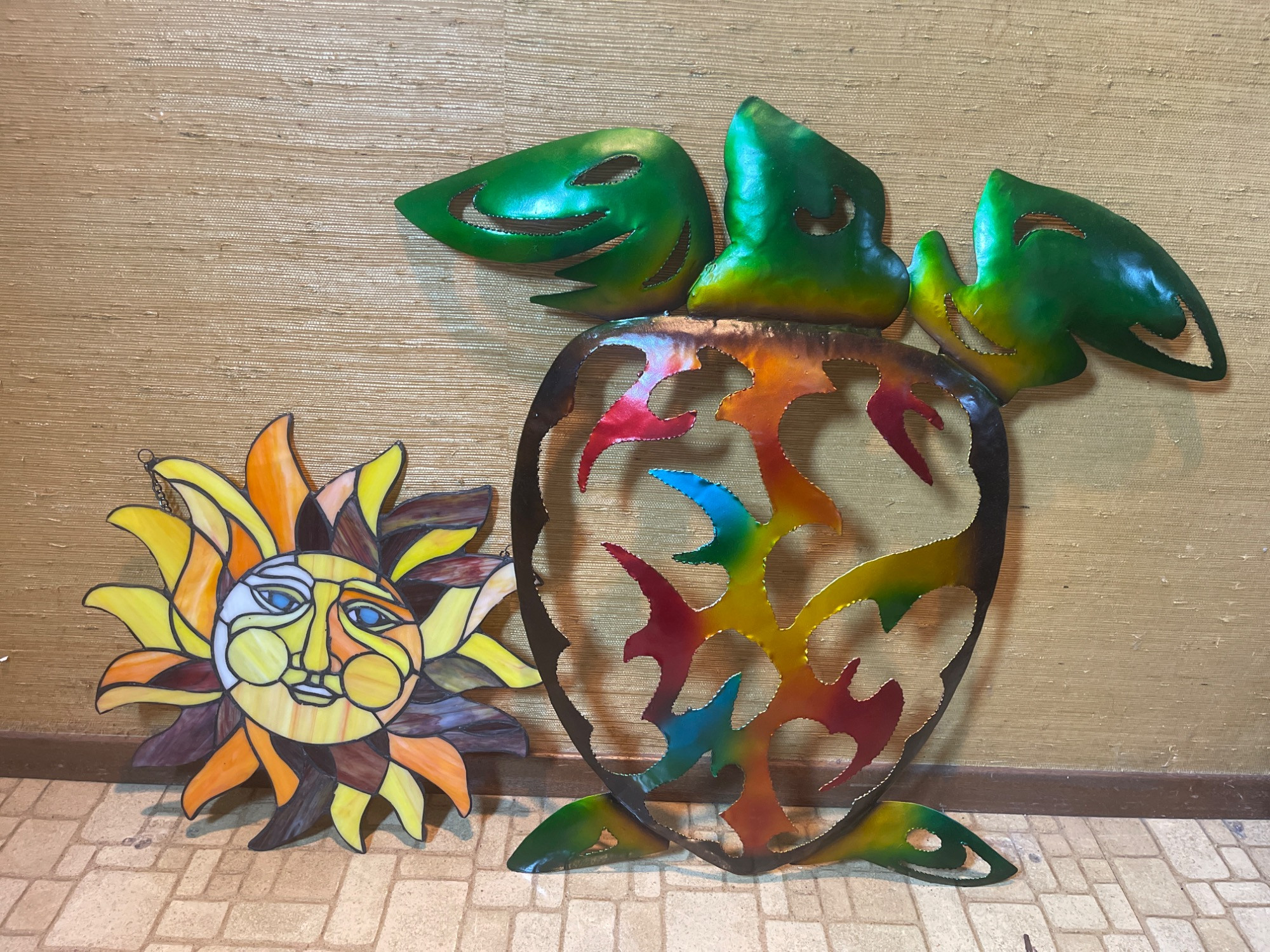 Vibrant pair of wall décor pieces including a whimsical resin sun with stained-glass-style coloration and a large metal sea turtle cutout in a rainbow gradient finish. Eye-catching and fun for indoor or outdoor use. Condition: Minor wear to surfaces; no major damage. Resin lining has some wear. Measurements: Sun: 14.5” W Turtle: 24" W x 23" H