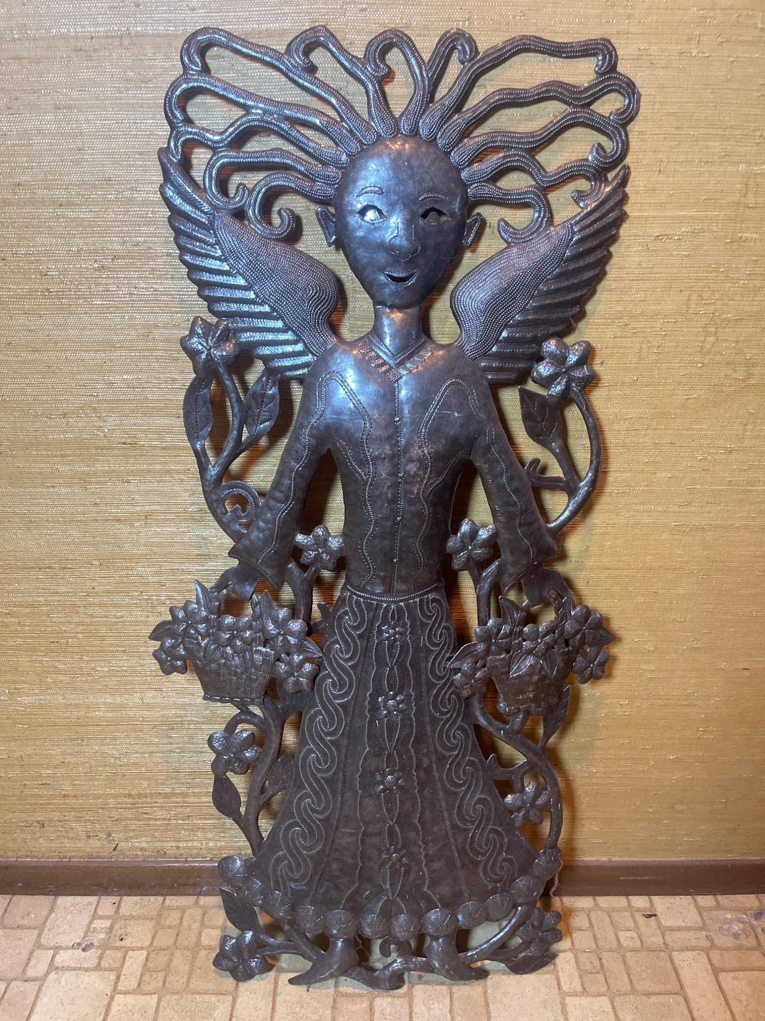 Striking handcrafted wall hanging featuring a Medusa-like figure with coiled serpentine hair, outstretched wings, and floral elements. Made from intricately cut and hammered metal with etched details throughout. The stylized figure holds baskets of flowers and is adorned in a flowing patterned gown, giving the piece both mythological and folk art appeal. A bold statement for eclectic or global-inspired decor. Condition: Good; minor wear consistent with handmade metal art