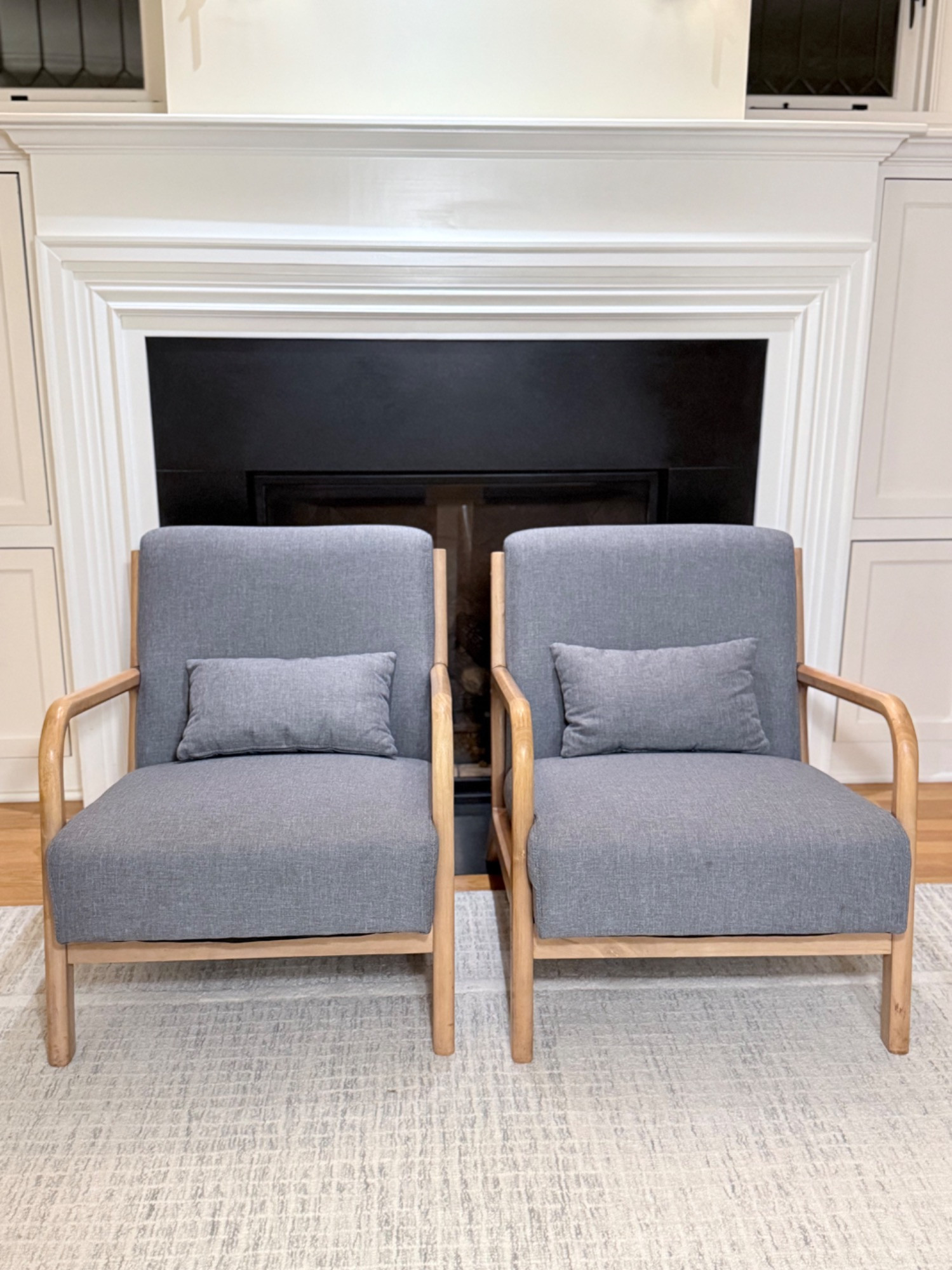 Pair of MCM STYLE Scandinavian Design Accent Chairs Contemporary accent chair with a light, natural-finish wood frame. The seat and back are upholstered in a medium-gray fabric, and there’s a small matching lumbar pillow placed against the backrest. The armrests and legs form a smooth, rounded silhouette, giving the chair a clean, modern look. The overall design is simple yet stylish, with a slightly mid-century or Scandinavian-inspired feel. Please note- color fading on the back of one of the chairs probably due to sun damage. Normal signs of wear but no obvious flaws or scratches. Comes with two chairs. 29.5" Height x 22.5" width x 34" depth. Seat Height: 17"