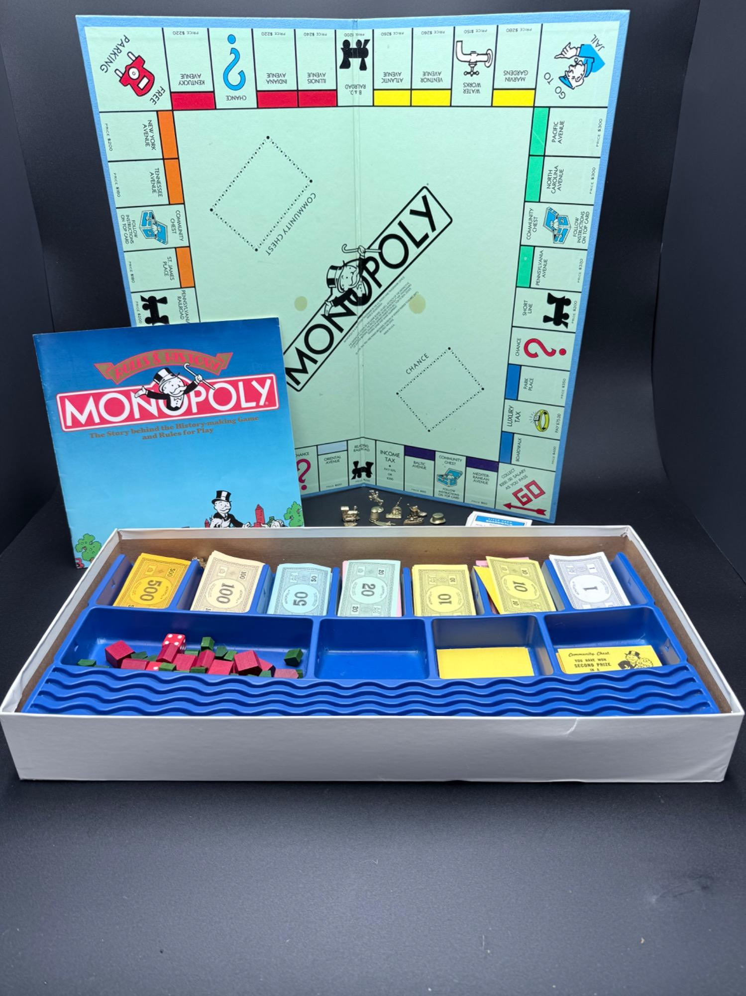Vintage Monopoly Deluxe Anniversary Edition – Parker Brothers Real Estate Trading Game Up for auction is a vintage Monopoly Deluxe Anniversary Edition by Parker Brothers, featuring bold retro artwork and the classic Monopoly branding with Mr. Monopoly front and center. This collector’s edition celebrates the timeless fun of the iconic real estate trading game—with a special twist. Deluxe Anniversary Edition with retro packaging Includes exclusive gold-tone train token – Special Anniversary Edition collectible piece Classic Monopoly gameplay with properties, houses, hotels, cards, and tokens Parker Brothers branding and vintage box design A nostalgic piece perfect for display or gameplay Condition: Box shows minor wear consistent with age. Please verify if all original components are present. The special edition train token is included, making this set especially desirable for collectors.Features: