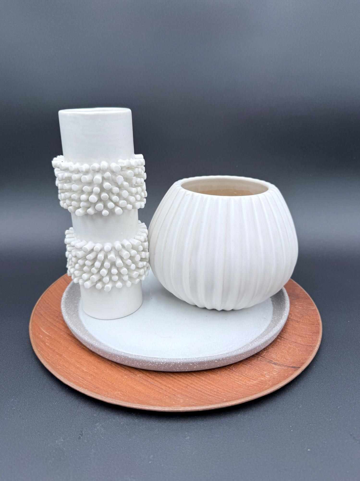 Modern Decorative Vase & Tray Set – Felt + Fat & West Elm (4-Piece Set) This beautifully curated decorative set features sculptural ceramic vases paired with layered trays for a modern, textural accent perfect for shelves, coffee tables, or entryway styling. Felt + Fat White Ceramic Vase Textured with raised dot detailing Dimensions: 8" tall x 3.5" wide Handcrafted in Philadelphia, PA Contemporary art pottery piece with standout design West Elm Ribbed White Round Vase Matte white finish with vertical ridges Dimensions: 7" wide x 5.5" tall Marked: "West Elm – Made in China" Gray Ceramic Tray Subtle speckled finish Diameter: 9.75" Wood Accent Tray Warm-toned round base Diameter: 12" Condition: all pieces clean with no chips or cracks. Style: Modern, Minimalist, Sculptural, BohoIncluded Items: