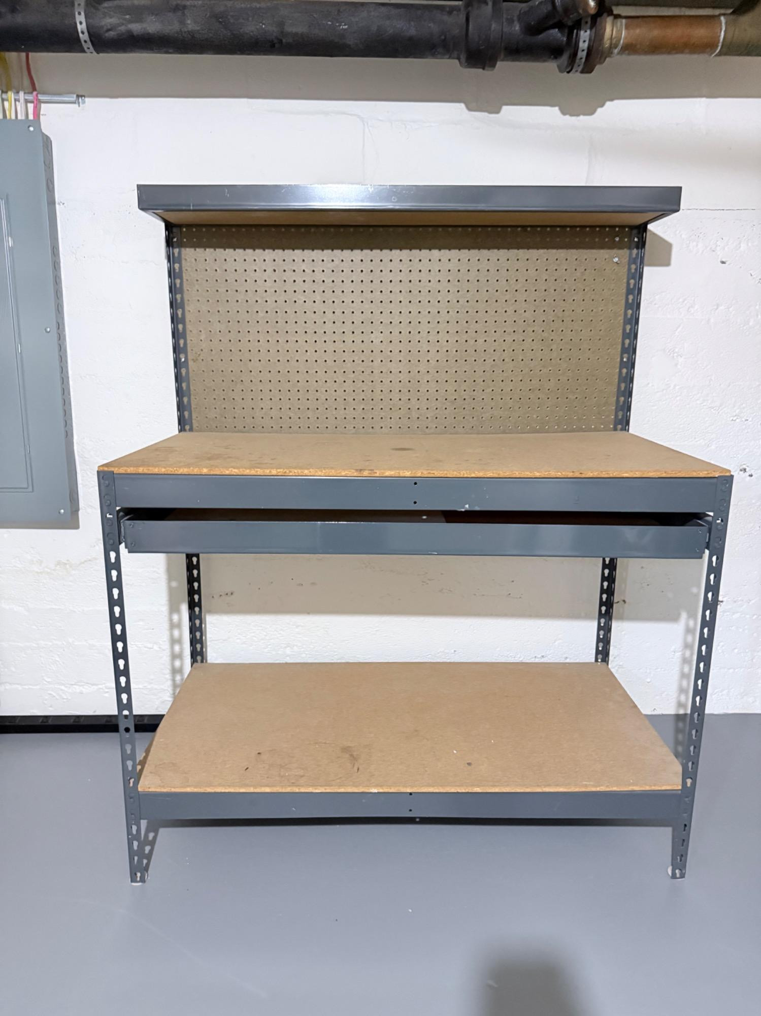 Heavy-Duty Metal Frame Workbench with Pegboard & Shelving – 60"H x 48"W This industrial-style workbench offers a sturdy and spacious setup perfect for garages, workshops, or utility rooms. Constructed with a durable metal frame and wood surfaces, it includes both storage and organization features to suit a variety of projects. Overall Dimensions: 60" height x 48" width x 24" depth Work Surface Height: 36.5" from floor Integrated Pegboard Back Panel – Great for tool storage and organization Multiple Shelves – Includes a large bottom shelf and top shelf for added storage Metal Support Frame – Provides excellent durability and stability Wood Surfaces – some stains and wear used; with only minor cosmetic wear from normal use. Pegboard and all shelving included as shown.Features: