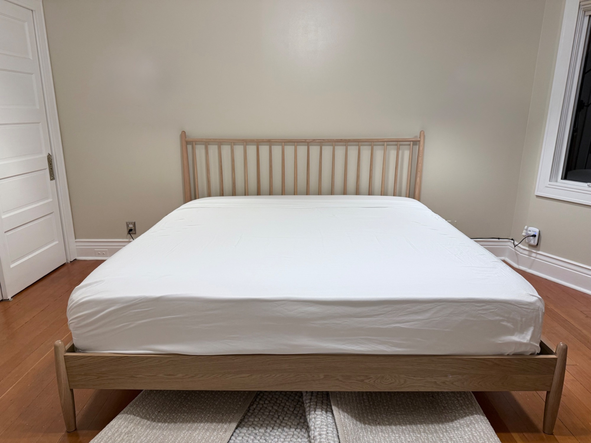 Modern Mid Century Wood Slat Bed Frame with Mattress (IKEA Style) This is a beautifully crafted wooden slat-style bed frame with a minimalist and Scandinavian-inspired design, similar to styles offered by IKEA. It includes a matching mattress. Details: Material: Light natural wood with vertical slat headboard Includes: Wooden bed frame and 11” deep mattress Headboard Dimensions: 45” high x 78.5” wide Bed Frame Length: 82” Height of Bed Platform: 13” from floor Support: Wooden slats with reinforced center support bar Condition: Excellent, sturdy construction, clean design Perfect for modern, mid-century, or minimalist interiors.