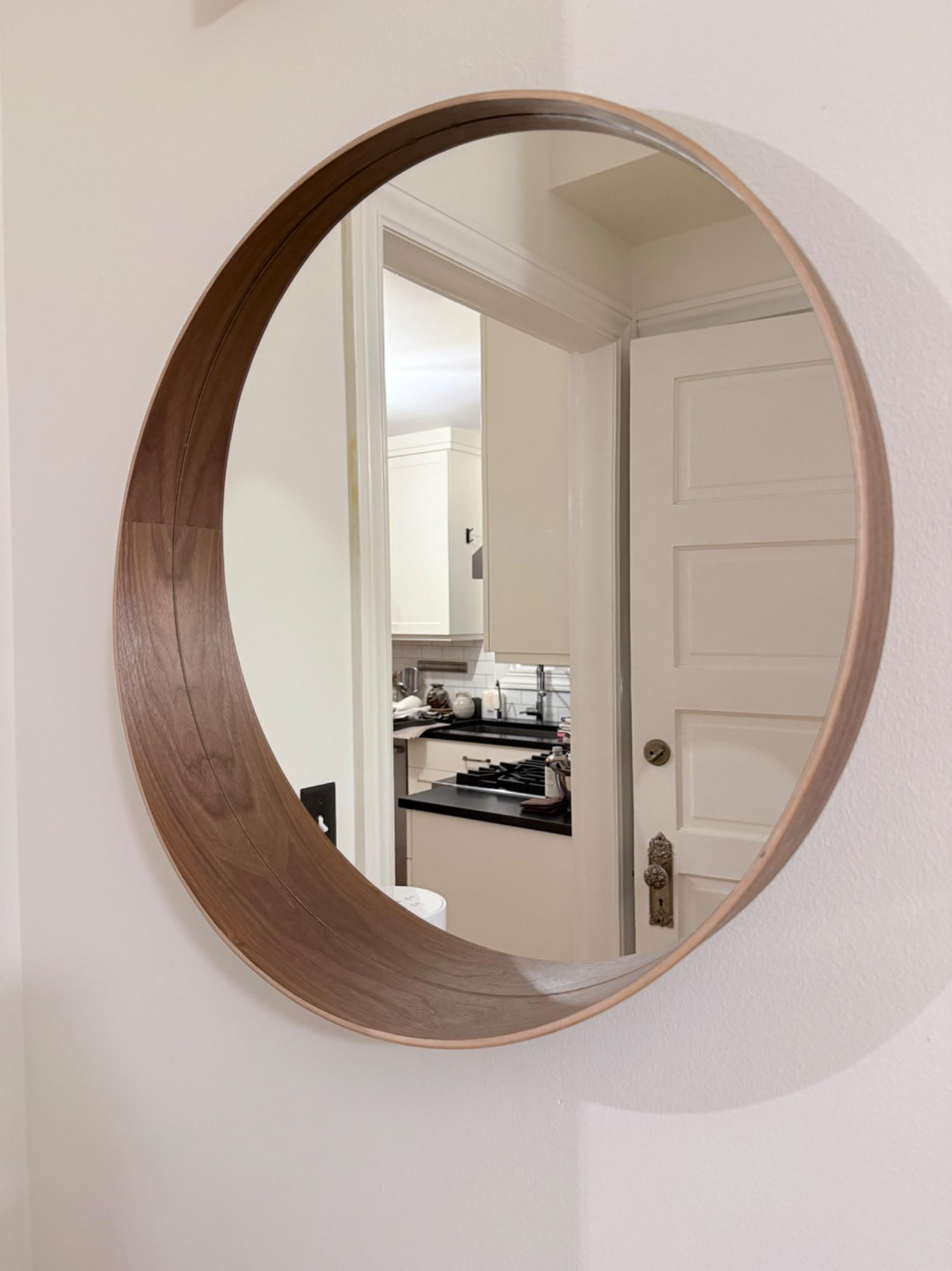The streamlined shape and the walnut veneer give each mirror a unique character. The frame around the bottom of the mirror forms a shelf where you can put your mobile phone or wallet. 24”