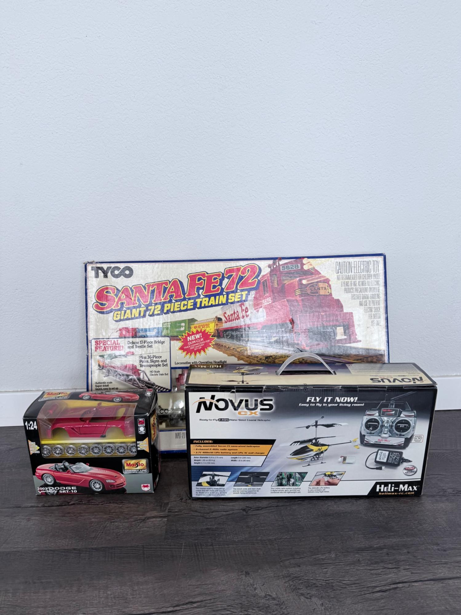 Tyco Electric Train Set, Novus Helicopter and Dodge Viper Model Kit. All appear to be unused. Did not test if train works, but it appears to be unused.