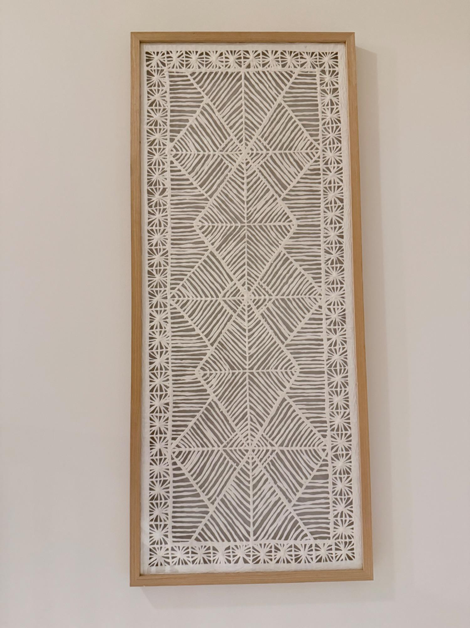 Handmade Geometric Wall Art in Natural Wood Frame This striking piece of wall art features a hand-carved, geometric abstract design with a symmetrical pattern of triangles and radiating lines. The textured white pattern sits on a soft gray background, bordered by intricate starburst-like motifs. The art is housed in a minimalist natural wood frame, creating a warm, organic contrast to the structured design. Medium: Mixed media on board with carved texture Frame: Natural wood Dimensions: 54" H x 23" W