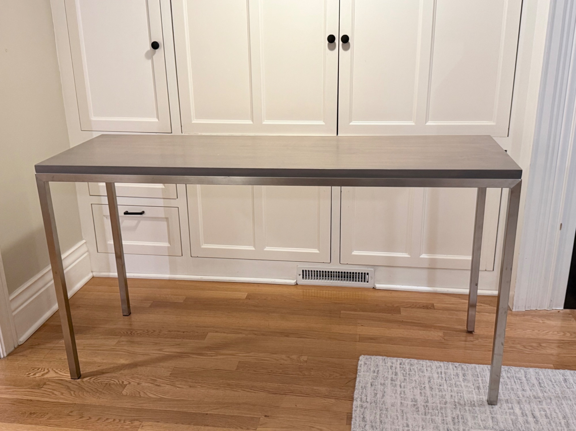 Streamlined and versatile, this modern table features a clean-lined silhouette with a brushed metal frame and smooth gray surface. Features: Top: Matte gray laminate or veneer surface Frame: Sturdy brushed metal legs and edging Style: Minimalist, industrial, modern