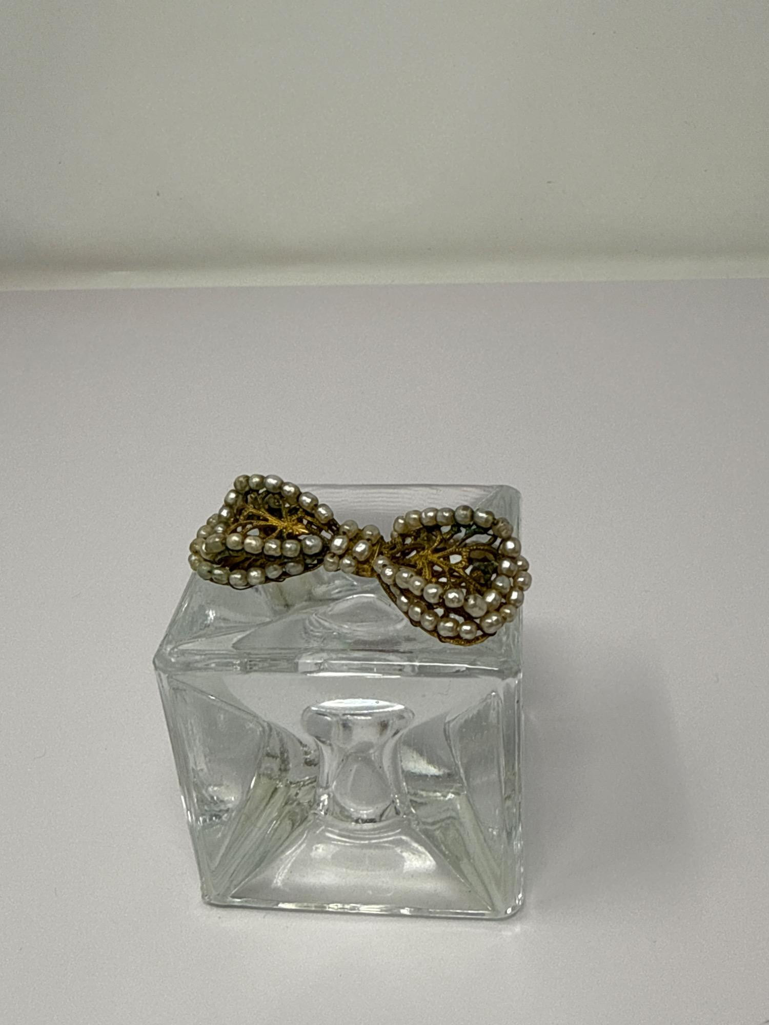 Vintage Miriam Haskell Bow Brooch with Faux Pearls and Filigree Back This lovely vintage brooch by Miriam Haskell features a graceful bow design with intricate gold-tone filigree work, beautifully adorned with two rows of small faux pearls. The signature Miriam Haskell oval cartouche is affixed to the back of the brooch, confirming its authenticity. The brooch is crafted in a classic feminine style, perfect for collectors of vintage costume jewelry or as a charming accessory for any outfit. The gold-tone setting has acquired a warm patina over time, and the delicate faux pearls add an elegant touch. Details: Maker: Miriam Haskell Design: Bow with faux pearl accents Material: Gold-tone metal, faux pearls