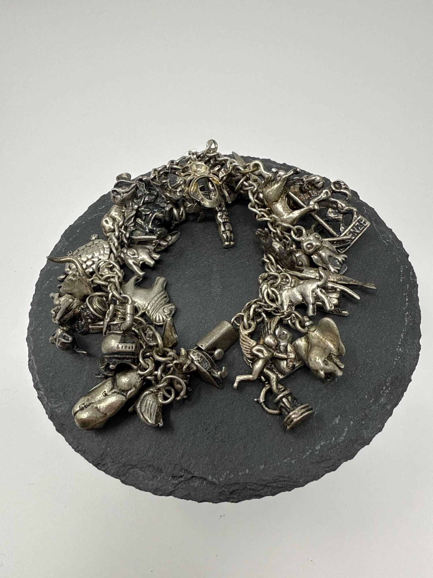 Vintage Sterling Silver Charm Bracelet – 88g This eye-catching vintage sterling silver charm bracelet features an incredible assortment of whimsical and detailed charms. Each charm tells a story, with a variety of themes including animals, travel, hobbies, and more — such as a mermaid, seahorse, totem pole, ballerina, Cupid, and a figure labeled "GREECE." The bracelet is heavily adorned, creating a dense, bold, and truly collectible piece. Material: Sterling silver Total weight: 88 grams Condition: Vintage patina present, consistent with age Clasp: Secure and functional 7.5" Length