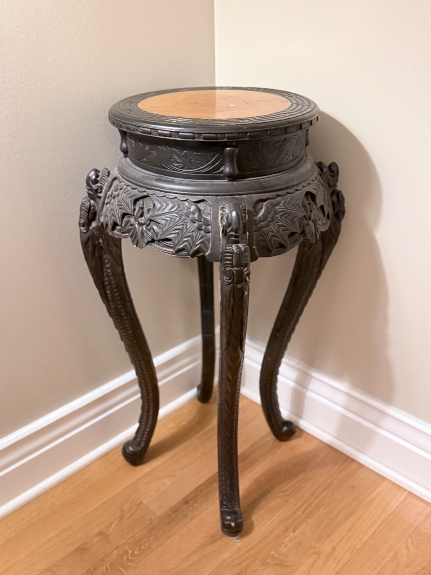 Hand-Carved Wood Accent Table – Ornate Floral Detail This beautifully hand-carved wood accent table showcases incredible craftsmanship with intricate floral and foliage motifs. It stands on four curving cabriole legs, each accented with bold leaf-like carvings and ball feet. The skirt is deeply detailed with botanical reliefs, and the round tabletop features an inset lighter wood center, offering contrast and elegance. Material: Solid carved wood Dimensions: Height: 31.5" Tabletop Diameter: 17" Total Diameter (including skirt): 21" Style: Traditional / Vintage Features: Rich dark stain, floral and scroll carvings, triple-tier base design