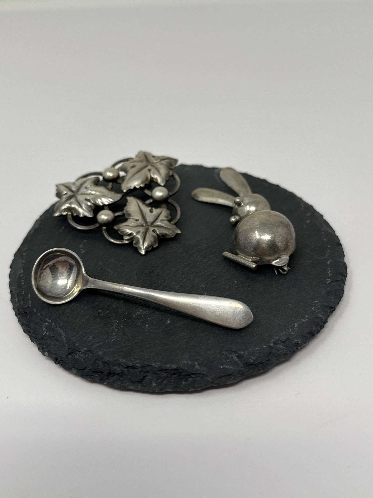 Spoon 2.5 S Kirk & Son bunny 2” leaf- 1.5” 3 Vintage Sterling Silver Brooches – Kirk & Son Spoon, Leaf Wreath, and Bunny Kirk & Son Sterling Silver Spoon Brooch, 2.5" A whimsical brooch crafted from a miniature sterling silver spoon, clearly marked "S. Kirk & Son Sterling" on the reverse. This brooch adds a touch of humor and vintage flair. Leaf and Berry Wreath Brooch, 1.5" Designed with a wreath-like motif, this brooch features detailed leaves and raised berry accents. Marked “925” on the back, it has a lovely natural aesthetic with an elegant, slightly dimensional profile. Rabbit or Bunny Sterling Silver Brooch, 2" This adorable brooch depicts a stylized bunny with exaggerated ears and minimalistic charm. Uniquely shaped and also marked “925,” it's a standout piece with personality.