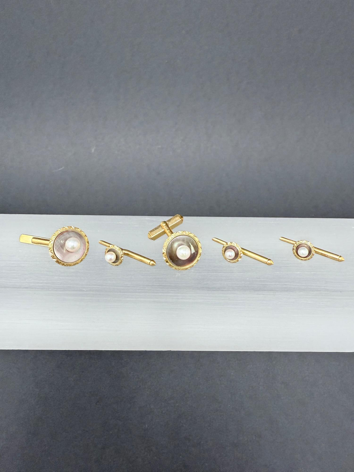 Lot # 11 - Vintage 14K Gold Cufflink & Shirt Stud Set – Mother of Pearl