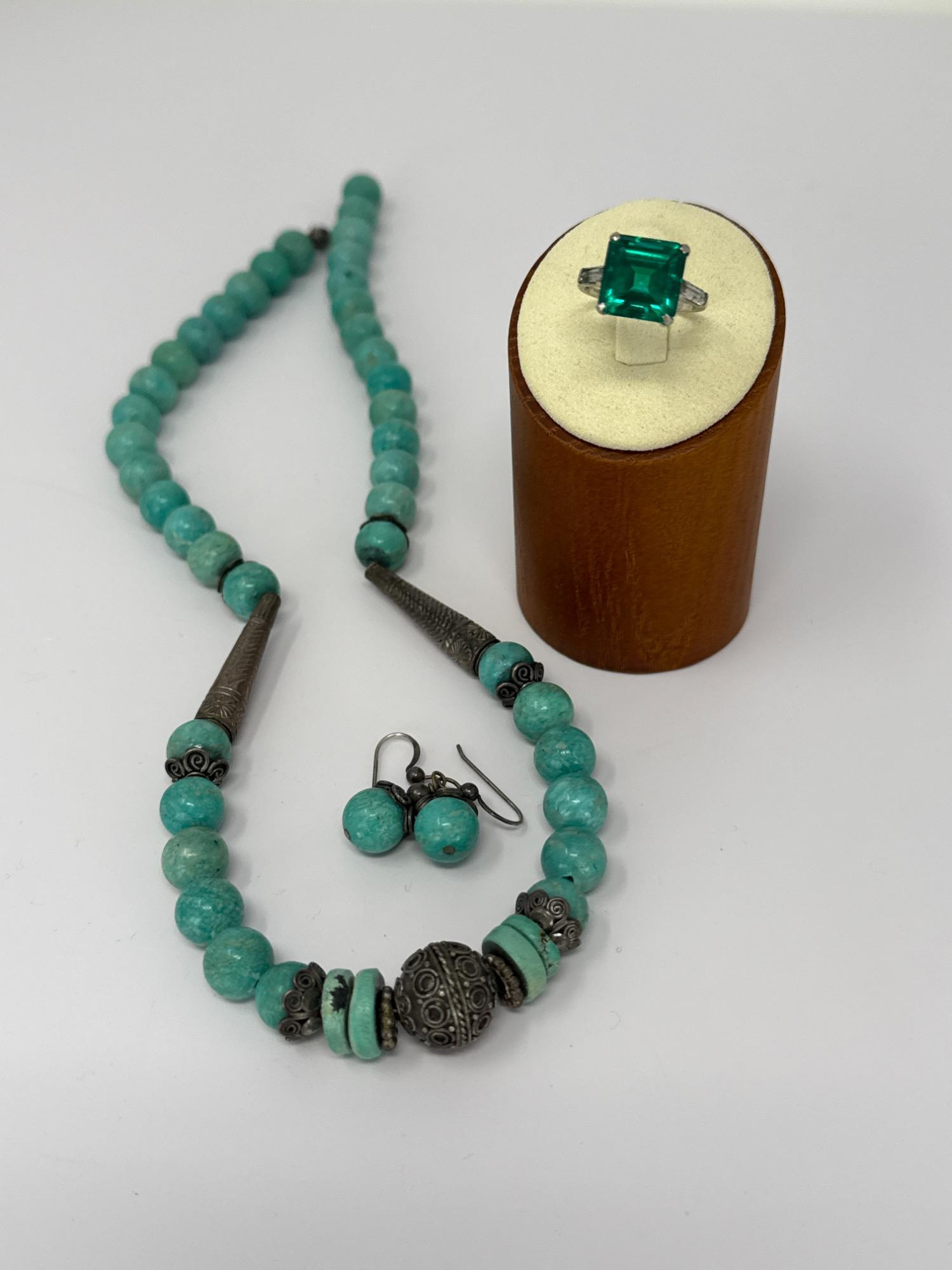 Necklace is 18" Ring size: 6.5 Sterling ring, glass stone settingVintage Amazonite and Filigree Sterling Jewelry Set