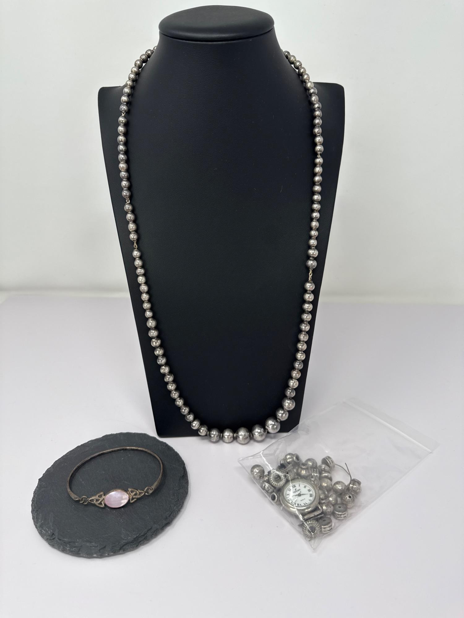 Sterling Silver Jewelry Lot – 3 Pieces – 52g Total Weight This elegant 3-piece sterling silver lot includes: Oxidized Sterling Silver Beaded Necklace (Mexico) Graduated silver beads strung with a secure clasp Marked "Mexico .925" on the clasp Approx. 23g in weight Peyote Bird Santa Fe Sterling Watch (for parts or repair) Southwestern-style watch bracelet with large decorative silver beads and stamped fan motif Face marked "Peyote Bird Santa Fe" In need of repair or restringing Approx. 22g in weight Celtic-Style Bracelet with Pink Shell Inlay Thin sterling band featuring Celtic knotwork and a pink shell center stone Approx. 7g in weight Total weight of sterling silver: 52 grams