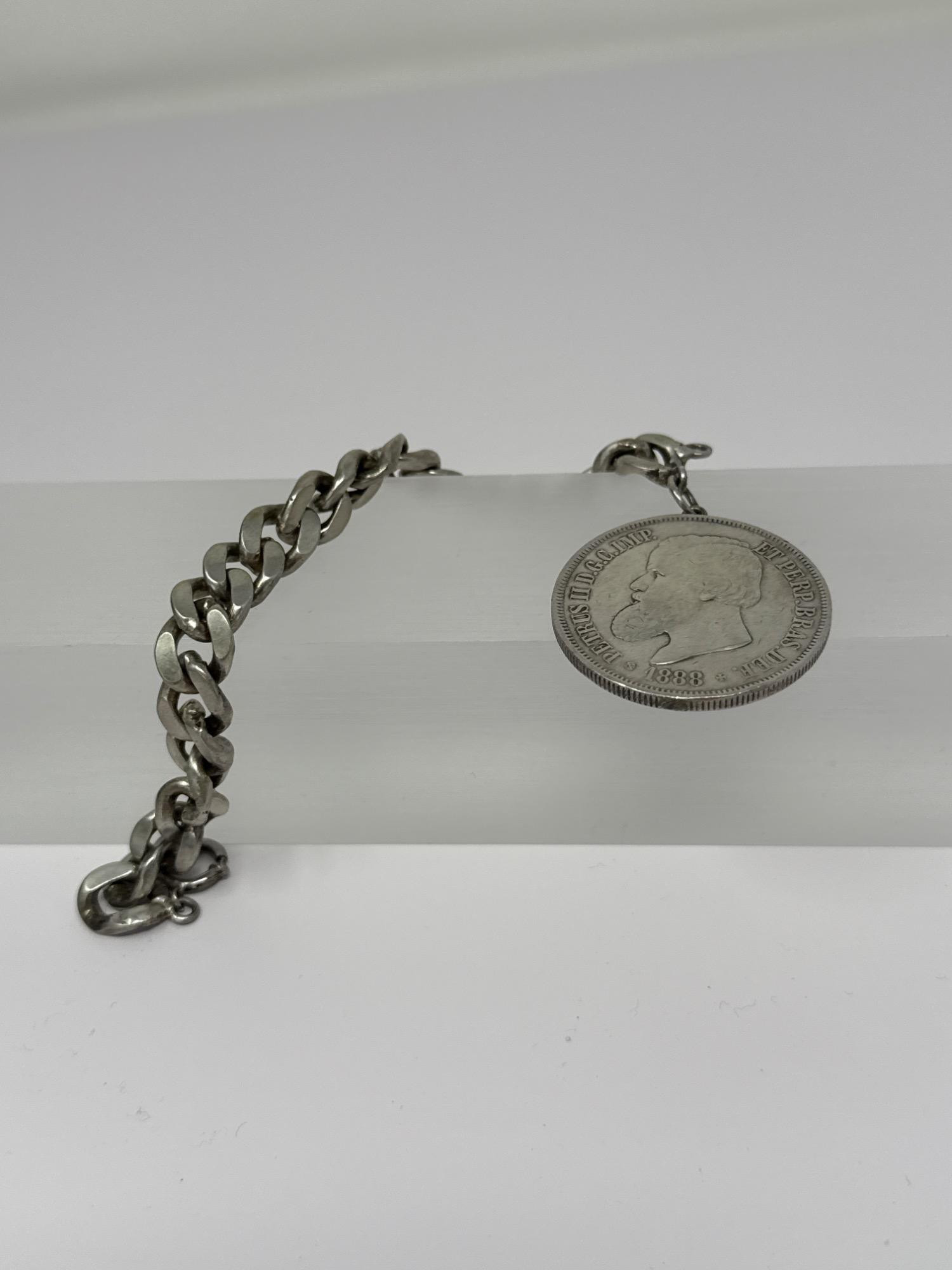 This striking vintage bracelet features a bold, chunky curb chain paired with a genuine 1888 Italian coin featuring King Umberto I of Italy (Umberto I Re D’Italia). Details: Bracelet Style: Heavy curb chain Charm: Genuine Italian coin dated 1888 Portrait of Umberto I (King of Italy, 1878–1900) "PETRUS II D.G. IMP. ET PERP. BRAS. DEF." inscription Total Weight: 67 grams Vintage Coin Bracelet – Heavy Curb Chain with 1888 Italian Coin Charm (67g Total Weight)