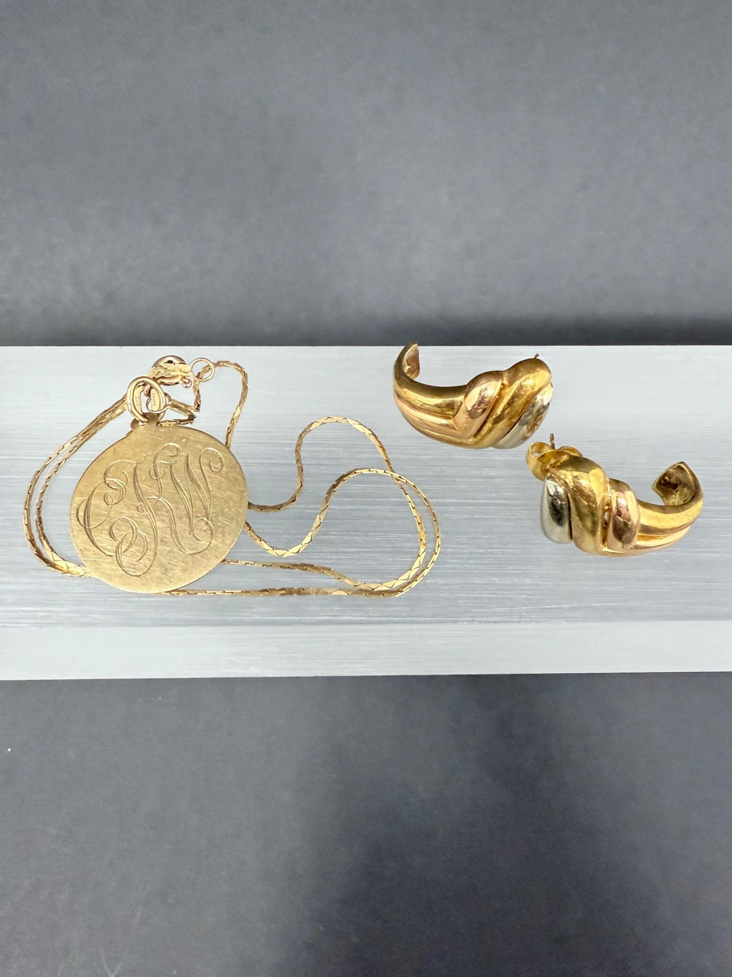 14K & 18K Gold Jewelry Lot – 12 Grams – Earrings & Engraved Pendant Bracelet This fine gold jewelry lot includes two pairs of earrings and a round engraved pendant on a chain, all crafted from solid gold and weighing a combined 12 grams. The lot features both 14K and 18K gold, confirmed by hallmarks and weight on a digital scale. 🔸 Pair of 18K Gold Tri-Color Knot Earrings Made in Italy, stamped “18K ITALY” Features yellow, white, and rose gold twisted design 0.75 inches long For pierced ears Stylish and timeless 🔸 14K Gold Pendant Bracelet Round pendant engraved with multiple names (possibly family names or a custom keepsake) Comes with an elegant 14K gold dual chain 6 inches long Lightweight and meaningful vintage style 🔸 Total Weight: 12 grams (confirmed on digital scale)Included in the Lot: