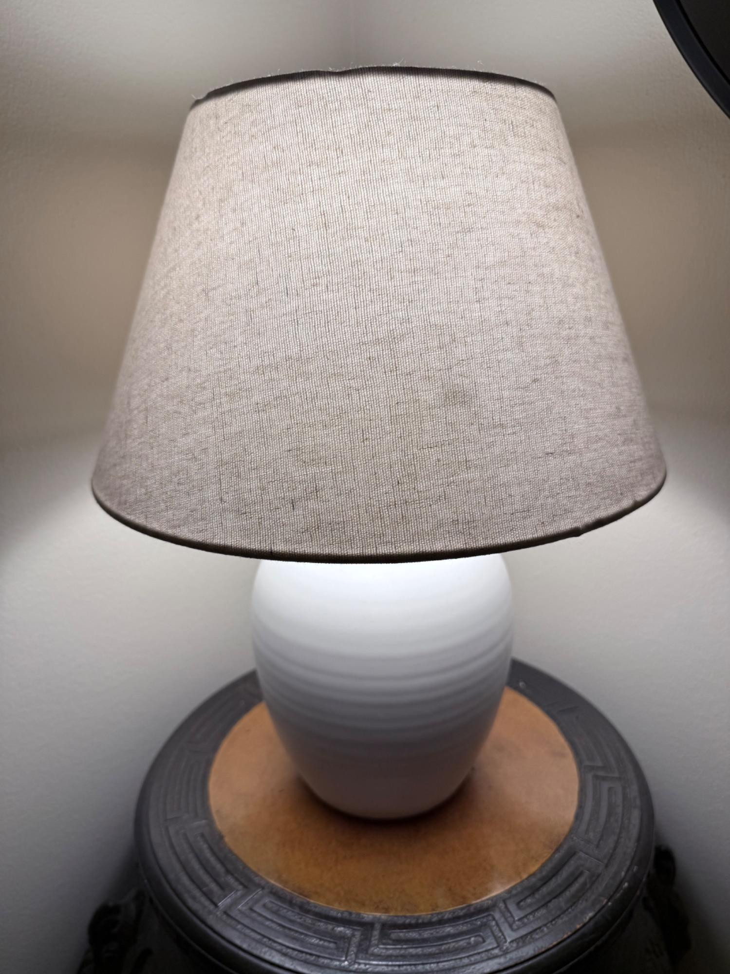 Featuring a smooth, rounded base in a gradient white finish and topped with a classic tapered linen shade. Features: Base: Matte ceramic with soft horizontal ridges in an ombre white/gray finish Shade: Neutral beige linen with a classic cone shape