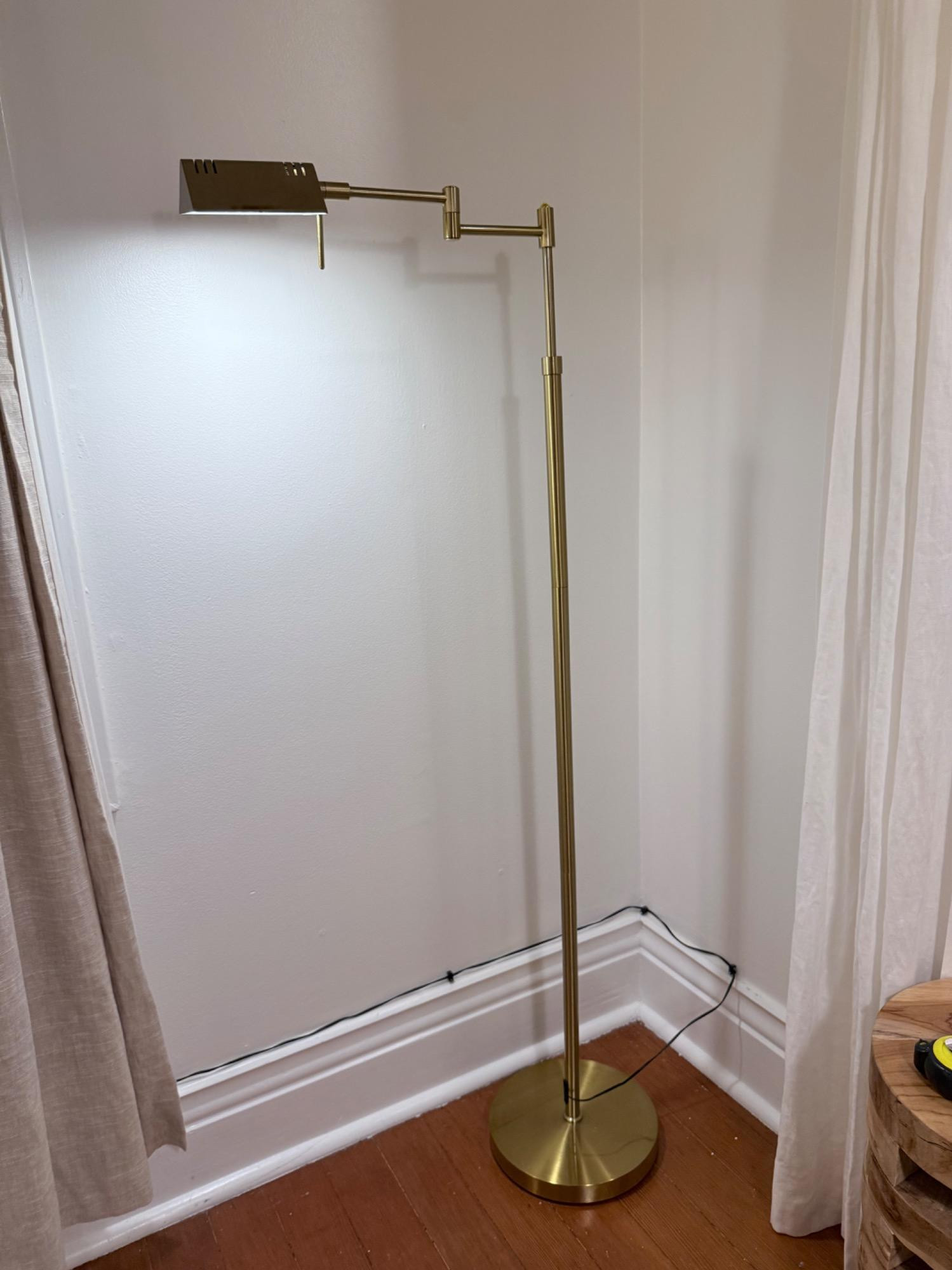 Featuring a sleek, adjustable arm and directional head, this lamp combines form and function in a modern silhouette. Features: Finish: Brushed brass for a warm, modern look Design: Adjustable height and pivoting arm for targeted lighting Base: Weighted for stability Shade: Directional rectangular metal shade with side vents