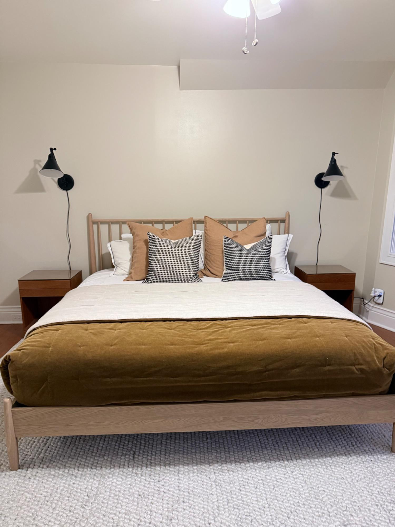 Elevate your bedroom with this beautifully styled bedding and pillow set in a calming, modern palette. Perfect for minimalist, Scandinavian, or contemporary spaces, this set combines comfort with aesthetic appeal. Included: 1 White Quilted Coverlet – Lightweight and breathable, with a subtle texture. Ideal for layering year-round. 1 Camel Velvet Comforter/Throw – Luxuriously soft with a rich, golden-brown hue that adds warmth and depth to the bed. 2 White Standard Pillows – Classic and clean, used as the base layer. 2 Large Camel Euro Shams – Oversized and plush, made with a soft fabric in a warm tan/caramel tone. 2 Black and White Accent Pillows – Featuring a modern small-scale pattern for contrast and interest. Fits Queen size bed.