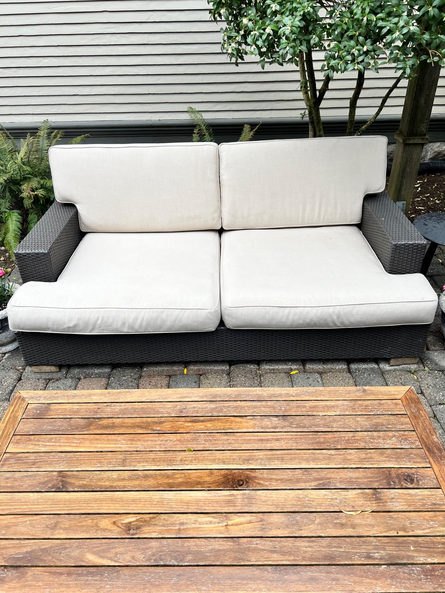 Restoration Hardware Outdoor Wicker Loveseat Sofa – 72” Wide with Cushions This premium Restoration Hardware outdoor loveseat combines modern comfort with classic patio style. Constructed from durable resin wicker in a dark woven finish, it includes two plush seat and back cushions in a light neutral fabric. Dimensions: Overall: 72” W x 39” D x 33.5” H Seat Height: Approx. 17" (including cushion) Features: Authentic Restoration Hardware (metal tag present) Sturdy resin wicker frame with textured weave Includes original seat and back cushions in an off-white/cream tone Stylish squared armrests and deep seating profile for extra comfort Neutral color palette complements any outdoor décor Condition: