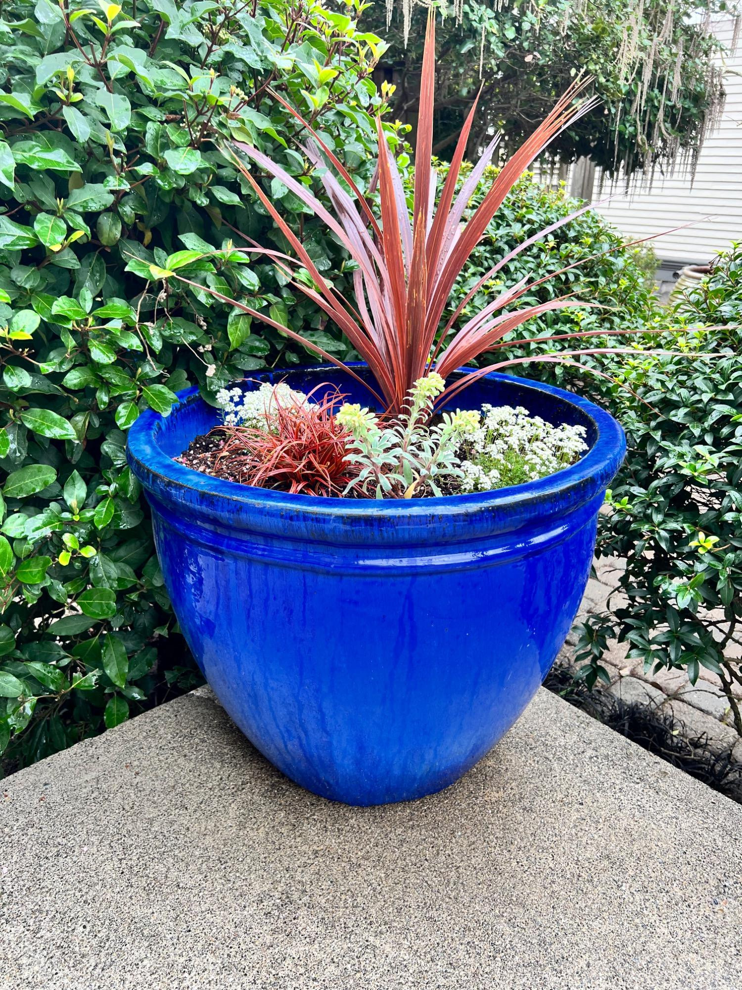 Large Cobalt Blue Glazed Ceramic Pot with Plants – 24” Diameter x 20” H Brighten up your garden or patio with this bold cobalt blue glazed ceramic planter, complete with a beautiful mix of established plants. The pot features a glossy, richly colored finish with slight natural weathering that adds to its charm. Details: Dimensions: 24" diameter x 20" height Material: Heavy ceramic with high-gloss glaze Color: Deep cobalt blue Condition: natural outdoor wear (see close-up photo for surface detail) Includes: