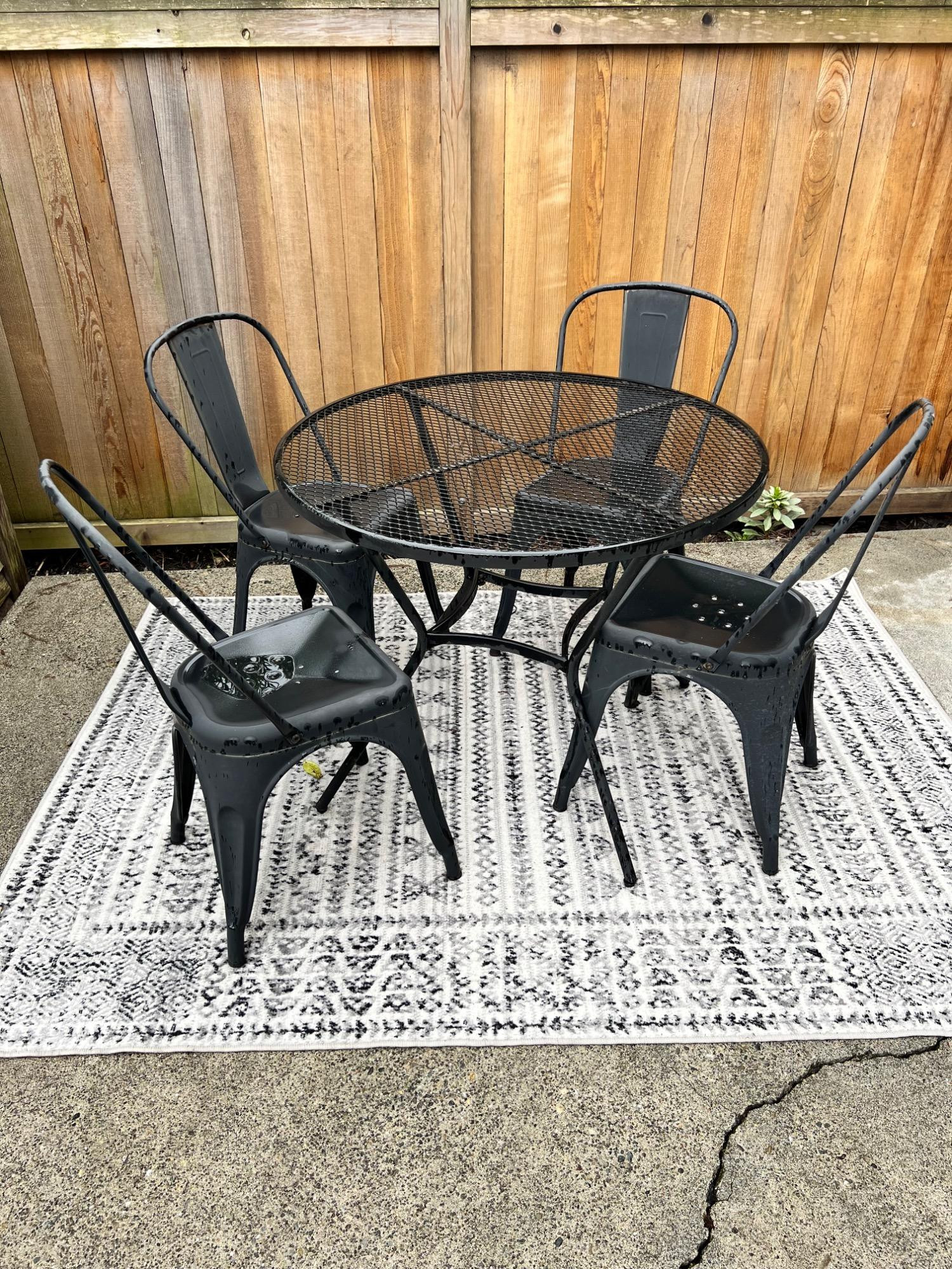 5-Piece Outdoor Dining Set – Mesh Metal Table & 4 Industrial-Style Chairs Enjoy stylish and functional outdoor dining with this 5-piece patio set, featuring a round black mesh metal table and four industrial-style powder-coated metal chairs. Perfect for patios, decks, or balconies. Table: Diameter: 36" Height: 28" Each Chair: Height: 33.75" Width: 18" Depth: 18" Seat Height: 17.5" Durable black powder-coated metal construction Table includes central umbrella hole Chairs have a vintage industrial look with curved backs and drainage holes Stackable design for easy storage Used, with cosmetic wear from outdoor use (see close-up of paint chipping on chair backs). Structurally sound and ready for use.Dimensions: