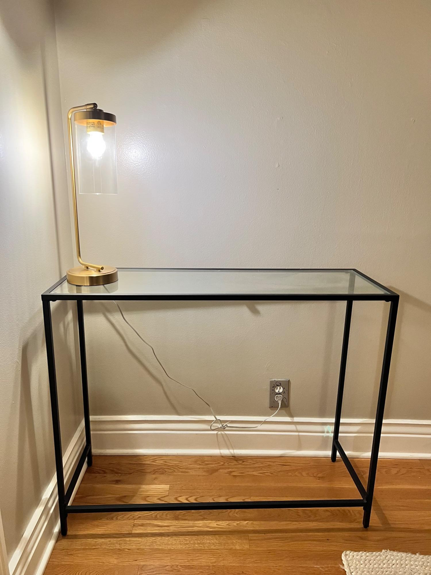 Modern Glass Console Table & Brass LED Lamp Set – Minimalist Style This two-piece set includes a sleek glass console table and a modern brushed brass LED desk lamp. Perfect for entryways, offices, or modern interiors seeking clean, minimalist design with functional flair. Dimensions: 39.5” W x 14” D x 32” H Clear glass top with black metal frame Lightweight yet sturdy – modern and versatile design Ideal for small-space living, hallway styling, or under-mirror use Dimensions: 20” H x 8” W x 6” D Brushed brass/gold-tone finish with clear cylindrical glass shade LED bulb included Features built-in USB port for device charging Touch on/off button on the base Both pieces are gently used and well-maintained. The lamp works perfectly and the table is free of cracks or chips.Console Table: