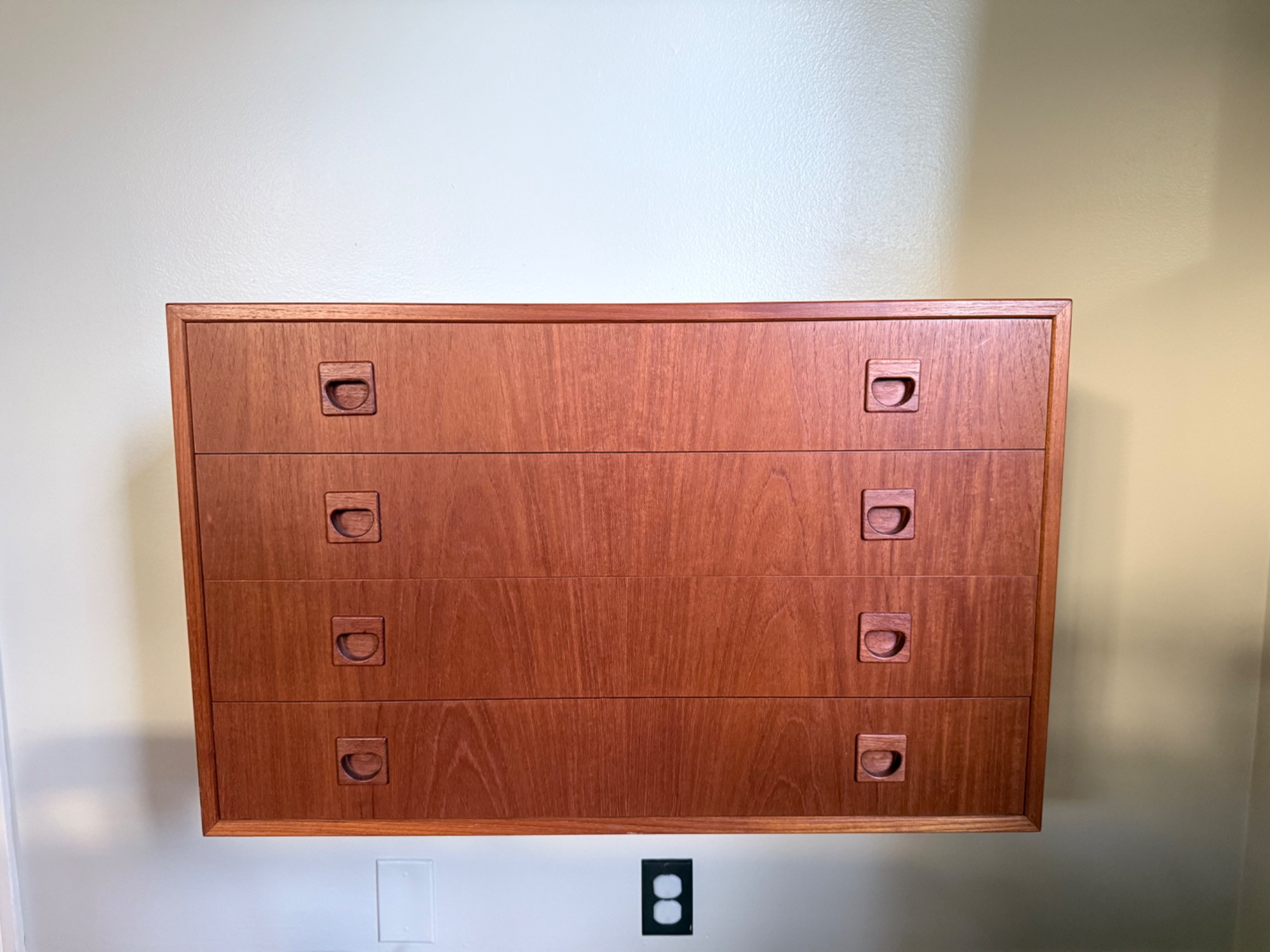Mid-Century Modern Floating Teak Veneer Wall-Mounted Hutch – Dovetail Joinery – Approx. 32"W Sleek and functional, this mid-century modern wall-mounted hutch features clean Danish-inspired lines, solid dovetail drawer construction, and a rich teak veneer finish. Designed to float above the floor, this piece mounts securely using a French cleat (included), making it ideal for small-space storage or display. Estimated Dimensions: Width: 32" Height: 20" Depth: 16" Features: Classic MCM design with integrated sculpted drawer pulls 4 dovetailed drawers with smooth operation High-quality wood construction with natural teak grain Wall-mount hardware (cleat) included Excellent for use as an entryway catch-all, media console, or office storage Condition: ****** You will need to bring a Phillips screwdriver to remove the wood attachment off the wall if you want to float this piece as shown in the picture.