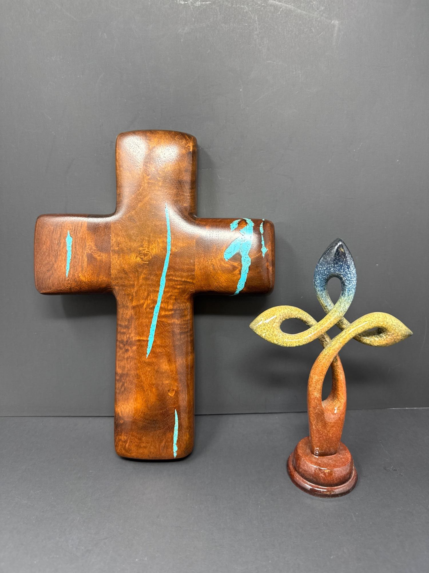 This unique set features two beautifully crafted religious pieces that seamlessly blend artistry with spiritual symbolism. Each piece showcases expert craftsmanship and thoughtful design. Mesquite and Resin Cross Atonement Cross - Imago Sculpture Condition: Both items are in excellent condition.