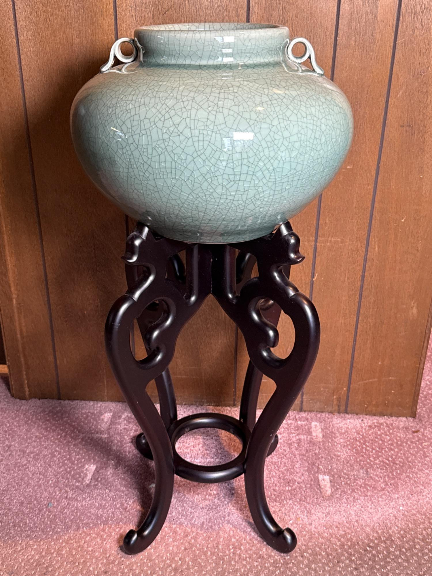Lot # 26 - Large Celadon Crackle Glazed Pot with Carved Wood Stand