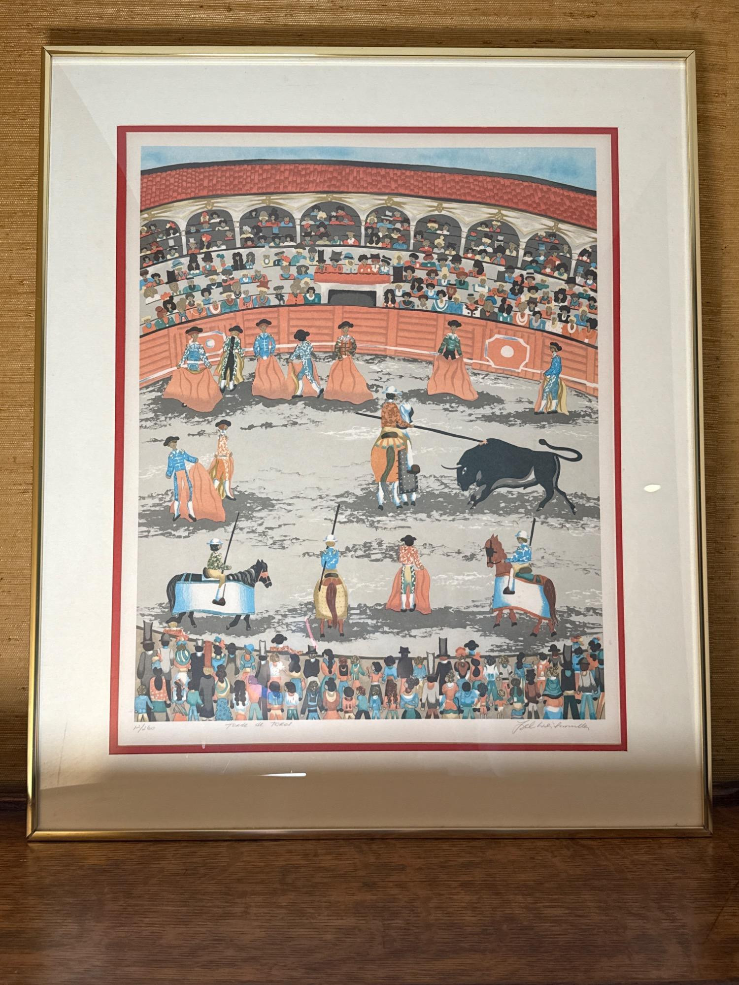 This vibrant and detailed limited edition print titled Tarde de Toros (“Afternoon of Bulls”) captures the lively tradition of Spanish bullfighting. Signed by the artist. The artwork showcases a dynamic arena scene filled with matadors, horses, and an animated crowd, all rendered in bold, saturated colors. Artist unknown. Title: Tarde de Toros Subject: Bullfighting Scene Medium: Limited Edition Print Edition: 12/260 Dimensions: Approximately 24" W x 28" T (including frame) Condition: Excellent vintage condition. The frame is intact with minor wear consistent with age, and the backing is secure with original stamp (20-3862).