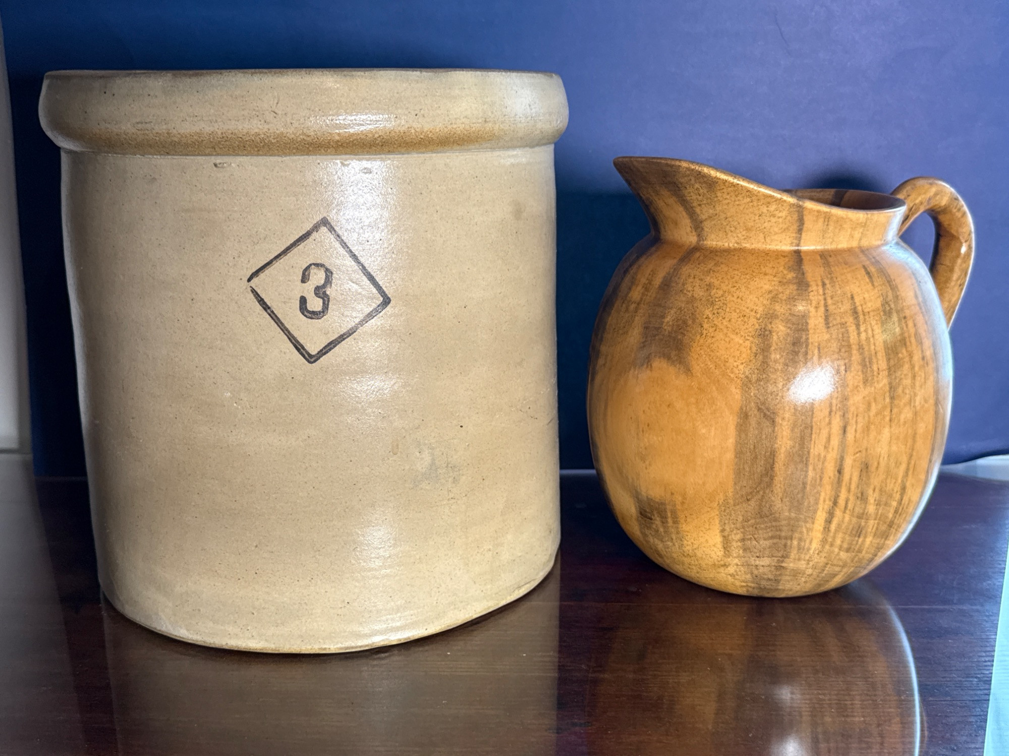 Lot # 41 - Vintage Stoneware Crock & Hand-Carved Wood Pitcher
