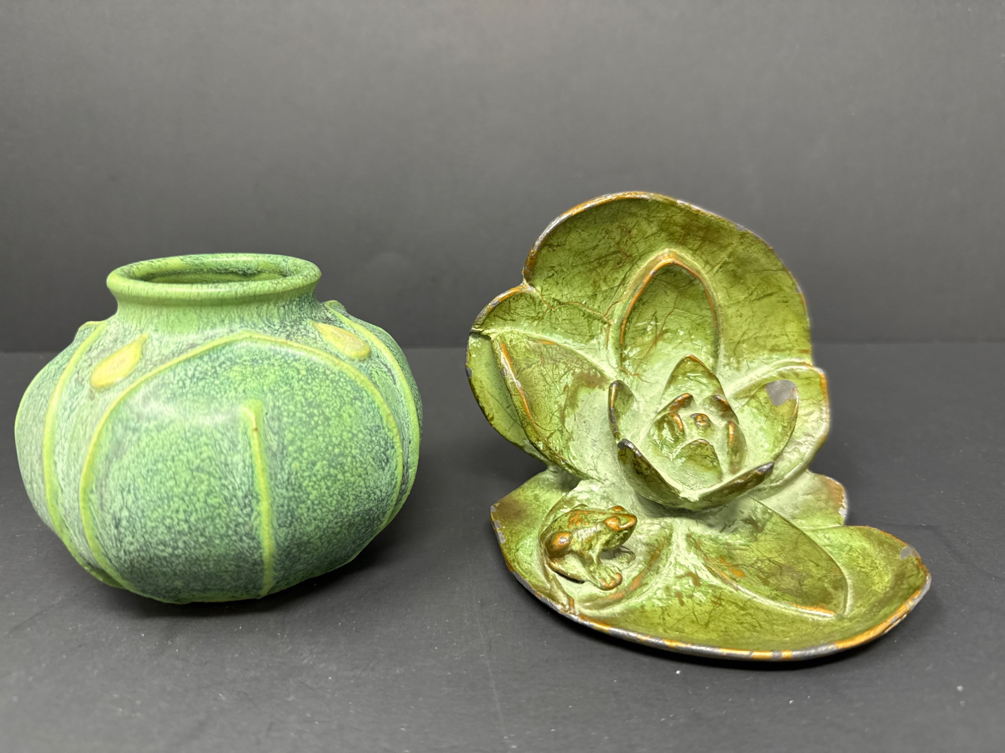 This unique collectible pairing includes an exquisite piece of Jemerick Pottery alongside a charming bronze sculpture titled "Frog and Water Lily", dated circa 1925. Jemerick Pottery Vase: A vibrant matte green, hand-thrown piece featuring organic leaf-like motifs in yellow and green tones. The bulbous form and flowing Art Nouveau-inspired lines make this a standout piece in any arts & crafts or studio pottery collection. Dimensions: 3.25” tall x 4” wide Bronze Frog and Water Lily Art: A beautifully detailed sculpture in green-patinated bronze, depicting a lily pad in full bloom with a small frog nestled at its base. A lovely nod to naturalist art of the early 20th century, with an original handwritten label on the underside reading: “Frog and Water Lily, c. 1925”. Dimensions: 3.75” tall x 3.25” wide Condition: Good vintage condition with some age-related surface wear and a natural patina. No visible structural damage.